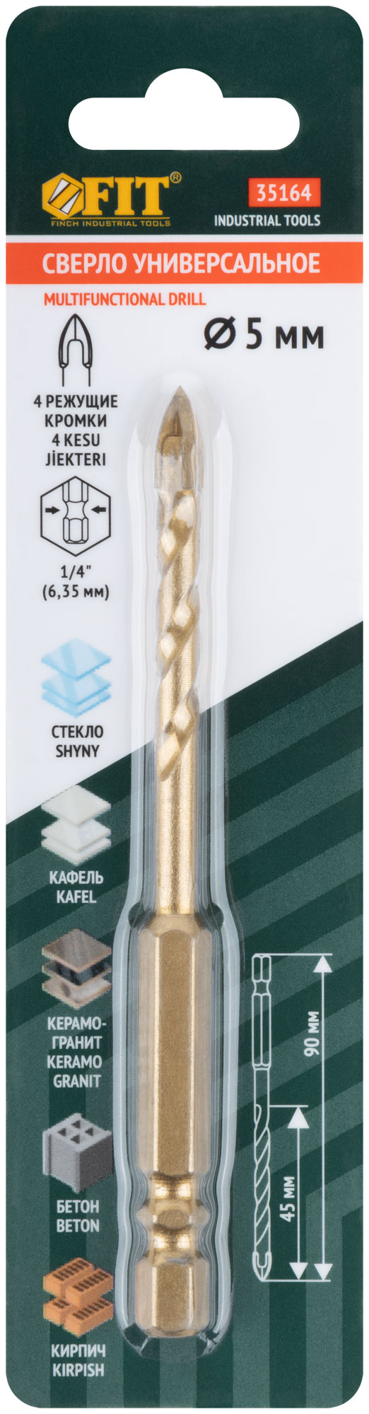 Сверло универсальное, 4 режущие кромки, титановое покрытие, шестигранный U-хвостовик под биту, 5х90 мм