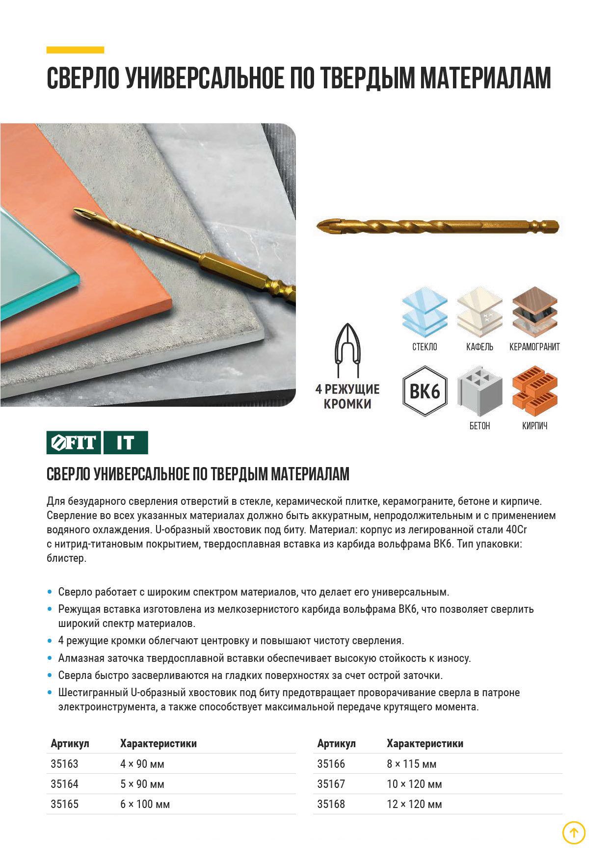 Для безударного сверления отверстий в стекле, керамической плитке, керамограните, бетоне и кирпиче. Сверление во всех указанных материалахдолжно быть аккуратным, непродолжительным и с применением водяного охлаждения. 4 режущие кромки для лучшей центровки и более высокойчистоты сверления. U-образный хвостовик под биту. Материал: корпус из легированной стали 40Cr с нитрид-титановым покрытием, твердосплавная вставка из карбида вольфрама ВК6. Упаковка: блистер.