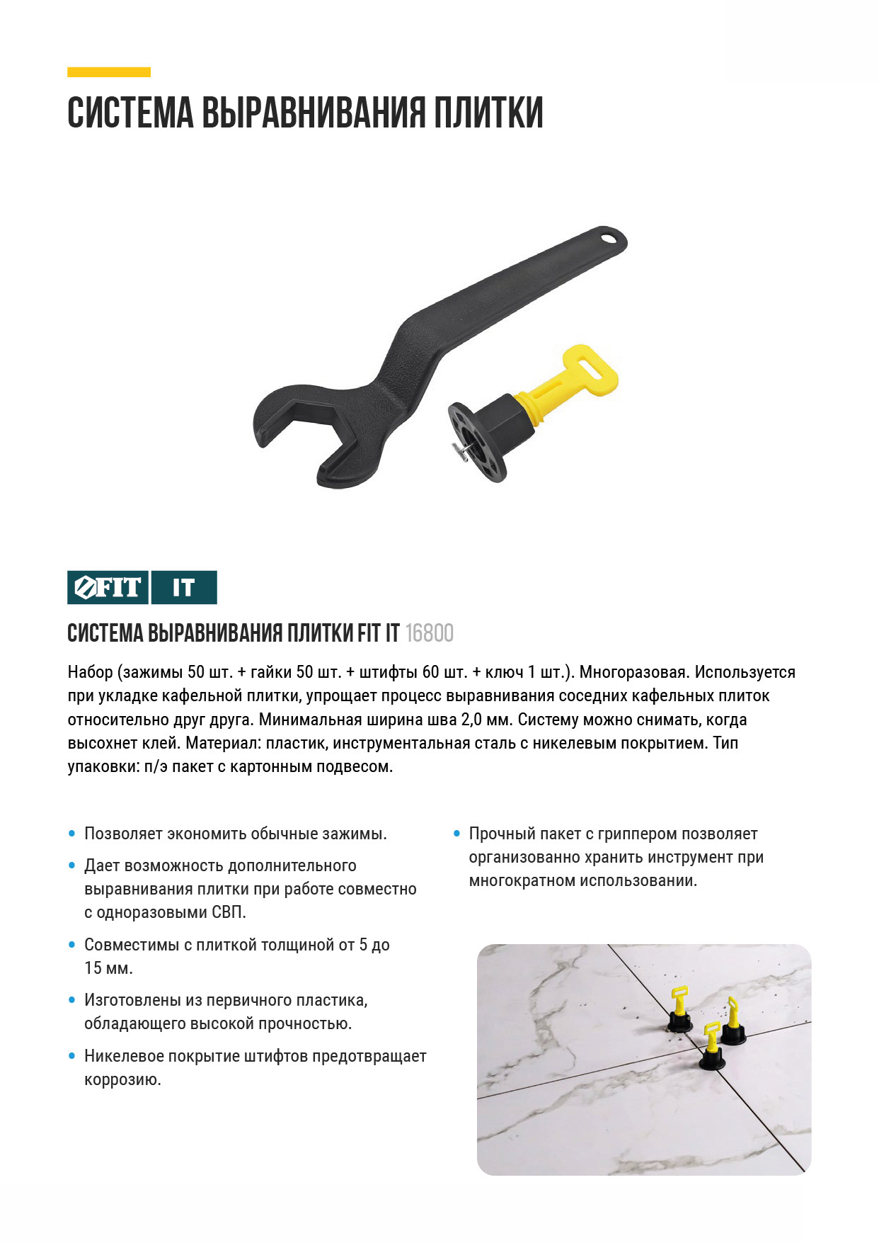 Многоразовая. Используется при укладке кафельной плитки, упрощает процесс выравнивания соседних кафельных плиток относительно друг друга. Минимальная ширина шва 2,0 мм. Систему можно снимать, когда высохнет клей. Материал: пластик, инструментальная сталь с никелевым покрытием.Упаковка: П/Э пакет с подвесом.