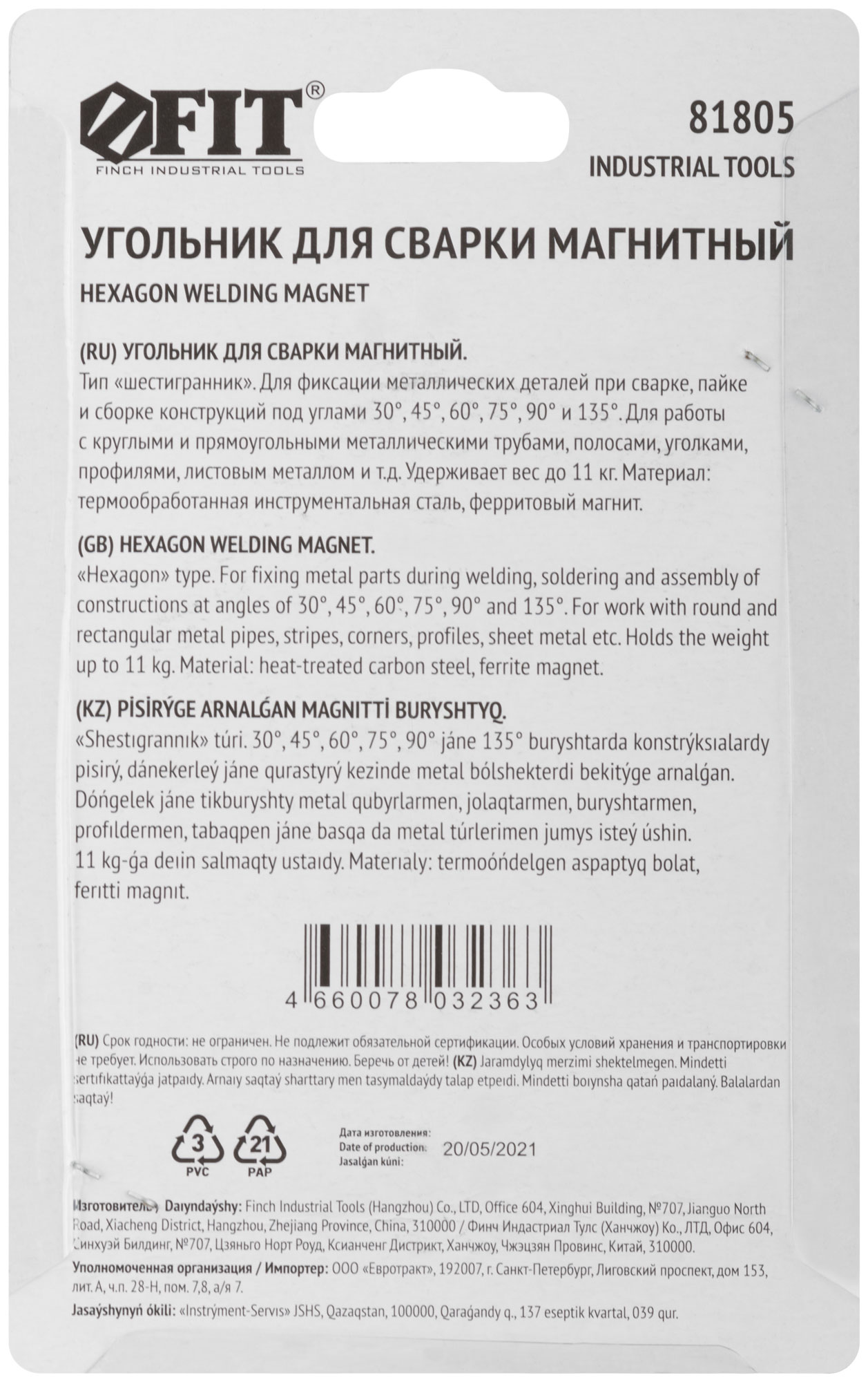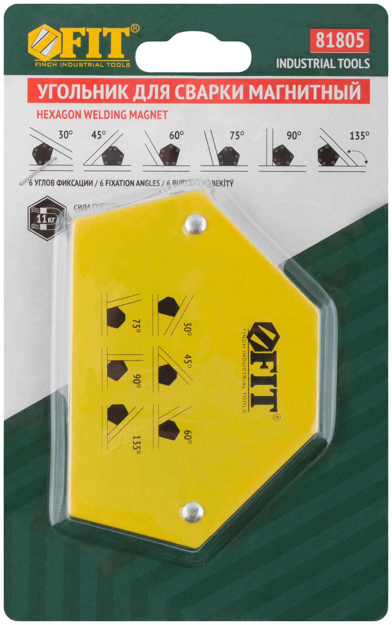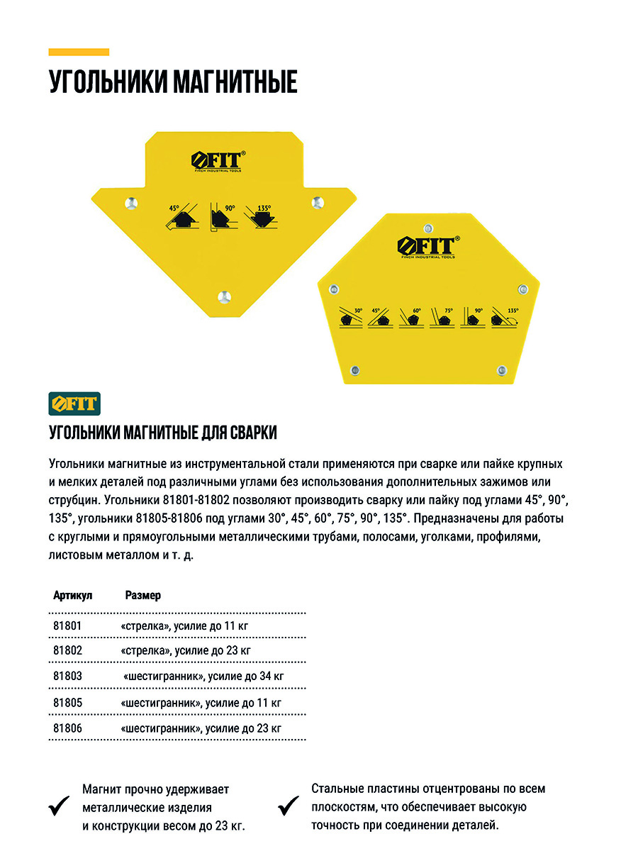 Тип «шестигранник». Для фиксации металлических деталей при сварке, пайке и сборке конструкций под углами 30°, 45°, 60°, 75°, 90°, 135°. Для работы с круглыми и прямоугольными металлическими трубами, полосами, уголками, профилями, листовым металлом и т.д. Материал: инструментальная сталь, ферритовый магнит. Упаковка: блистер.