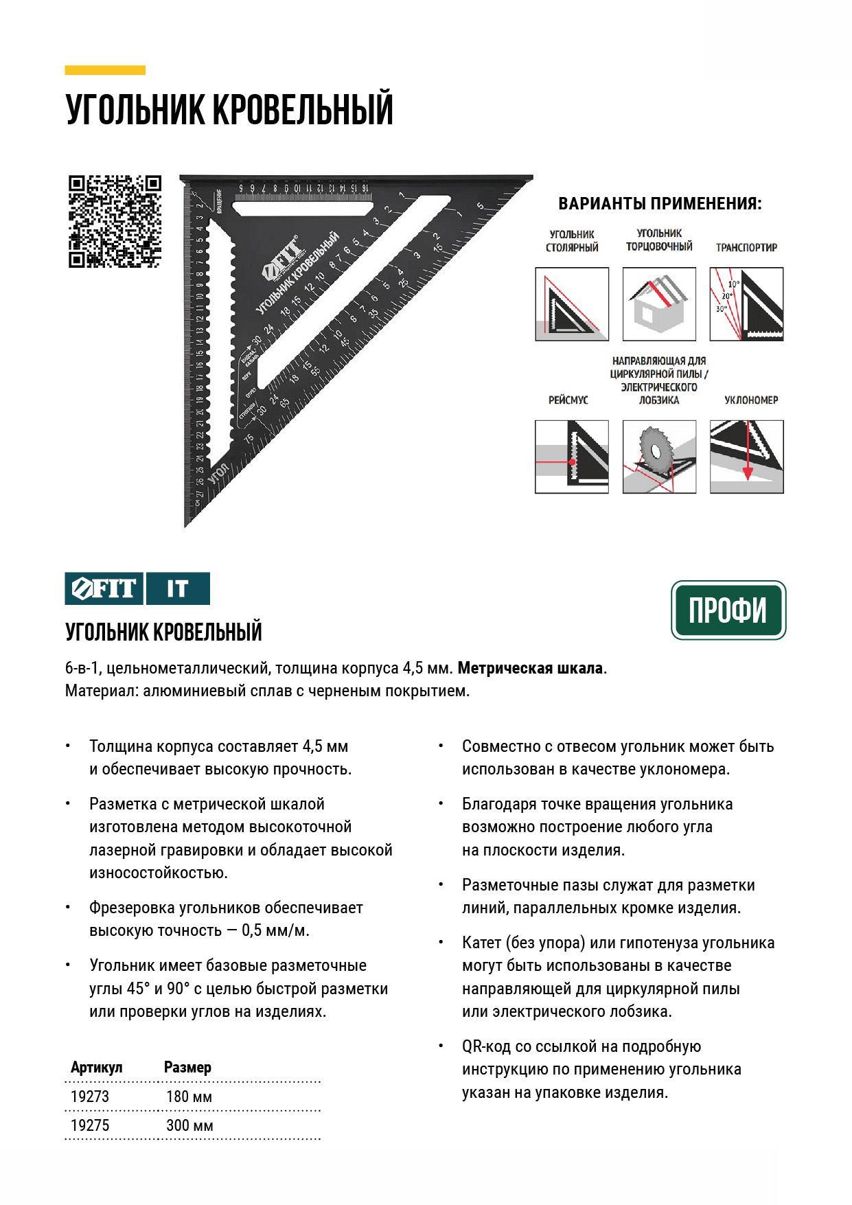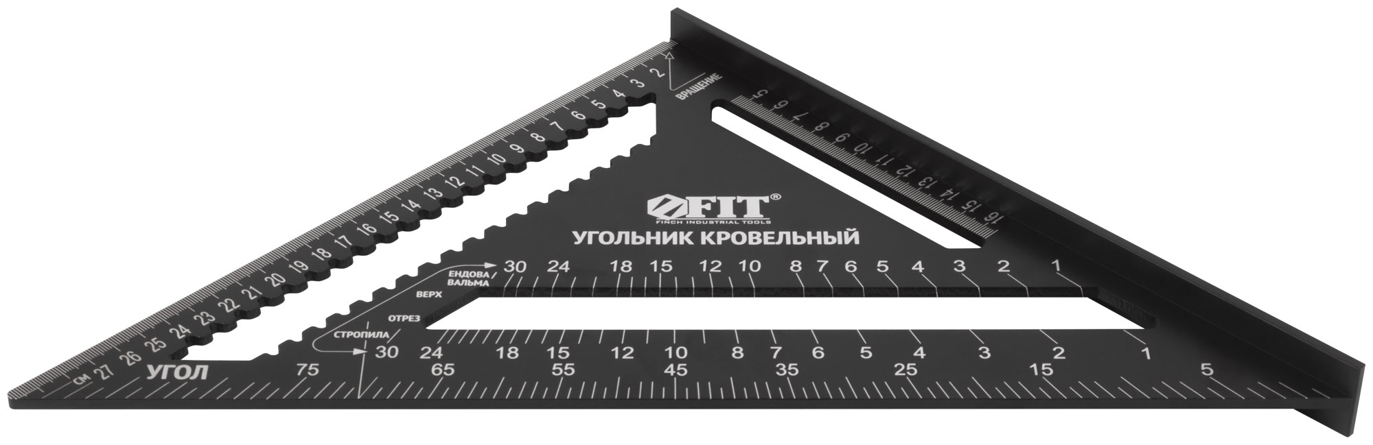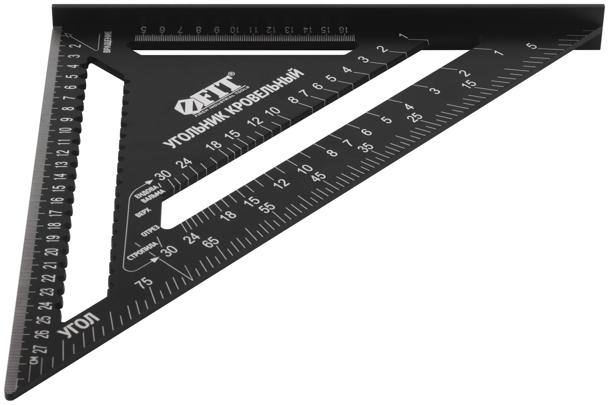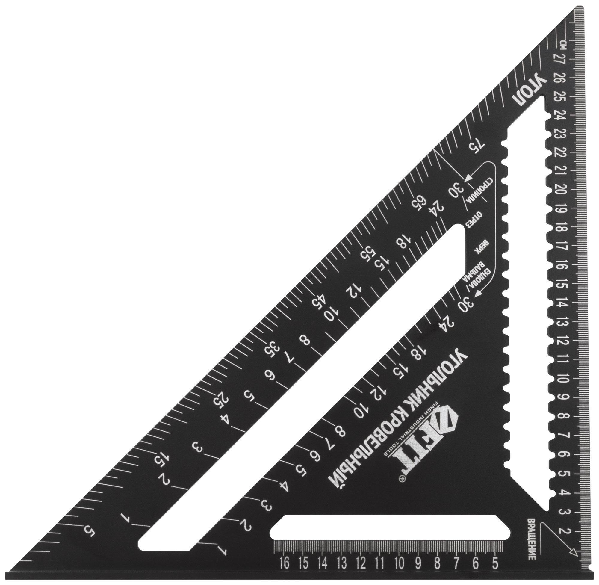 Универсальный. Для кровельных и других работ. Износостойкая шкала с высокоточной лазерной гравировкой. Упорный выступ для удобства в работе. Толщина корпуса 4,5 мм. Варианты применения: 1. угольник столярный 2. угольник торцовочный (для разметки стропил кровли) 3. транспортир 4. рейсмус (для создания линий, параллельных краю доски) 5. направляющая для циркулярной пилы / электрического лобзика. 6. уклономер (в случае применения со строительным отвесом). Материал: алюминиевый сплав с черненым покрытием.