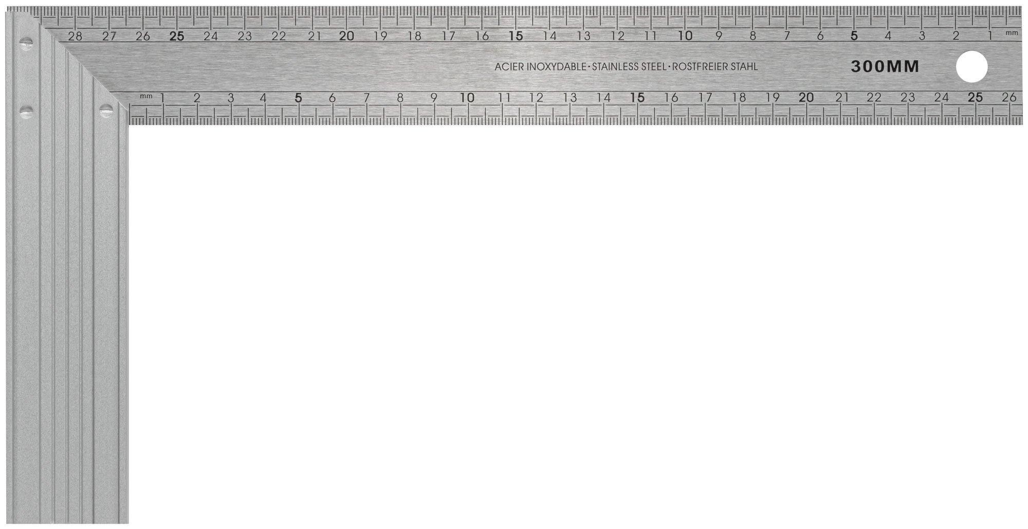Профи. Шкала двусторонняя рифленая. Материал: алюминиевое основание, линейка из нержавеющей стали.
