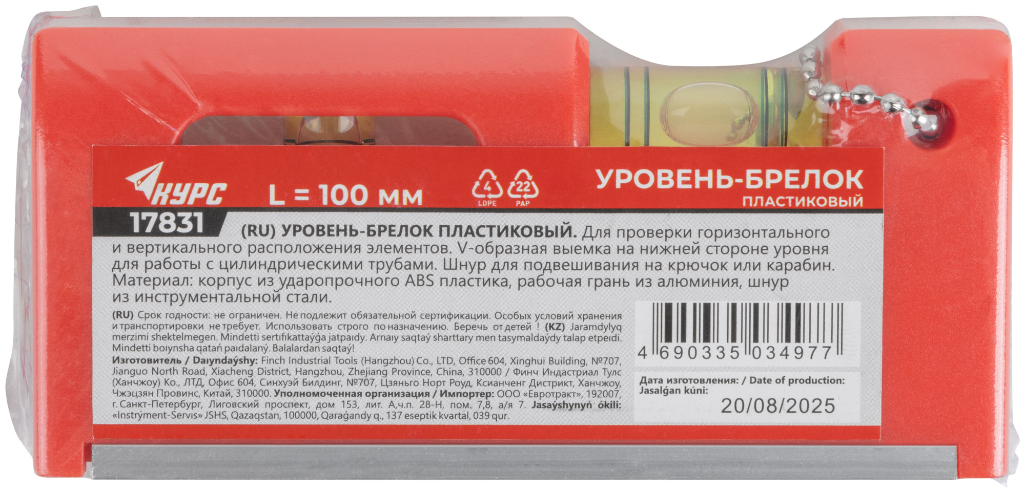 Уровень-брелок пластиковый, 2 глазка 100 мм