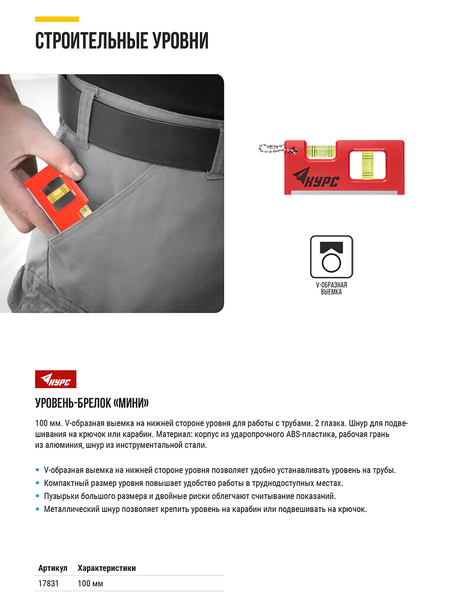 «Мини». V-образная выемка на нижней стороне уровня для работы с цилиндрическими трубами. 2 глазка. Шнур для подвешивания на крючок или карабин. Материал: корпус из ударопрочного ABS пластика, рабочая грань из алюминия, шнур из инструментальной стали.