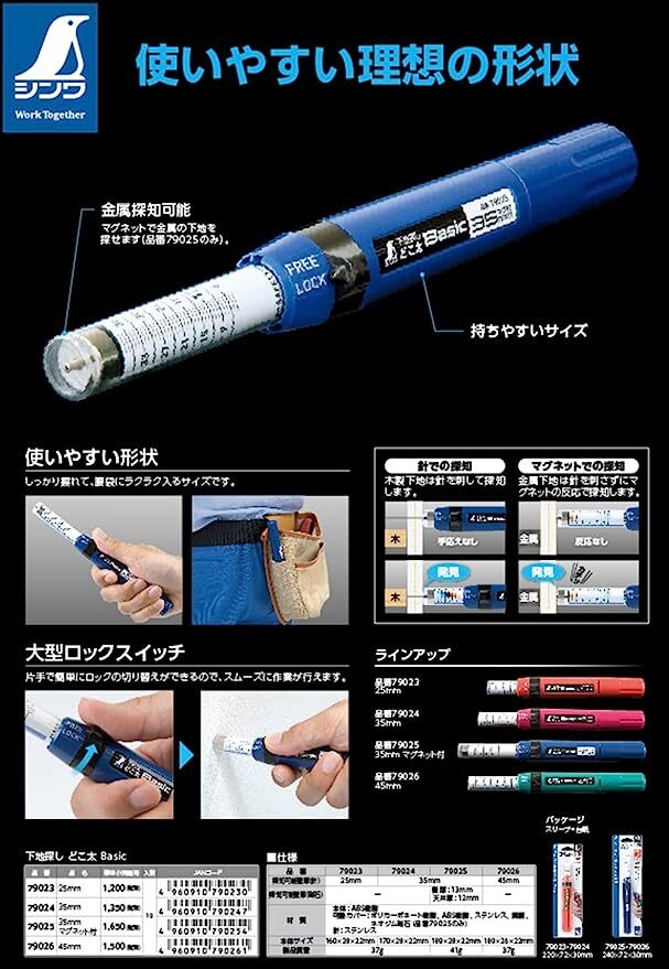Устройство для поиска скрытых конструкций Shinwa. Представляет из себя конструкцию со спрятанной иглой и утапливаемой шкалой. Позволяет путем протыкания листового материала обнаружить любую скрытую конструкцию. Игла выполнена из стали. Также в комплекте (рукояти) вложены запасные иглы. Производство Shinwa (Япония).