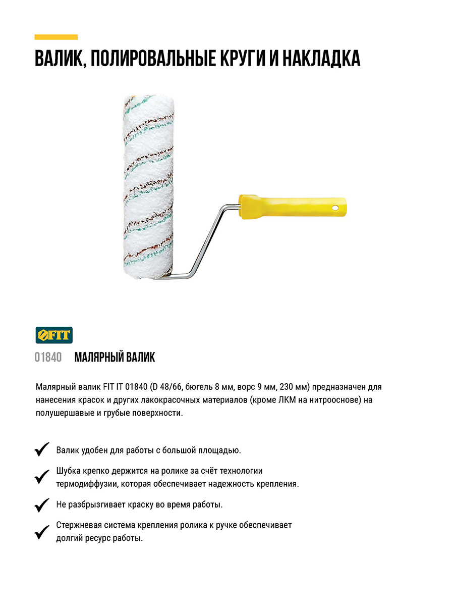 D 48/66, бюгель 8 мм, ворс 9 мм. Для полушершавой и грубой поверхности. Используется со всеми видами лакокрасочных материалов (кроме ЛКМна нитрооснове). Шубка крепится к ролику по технологии термодиффузии.