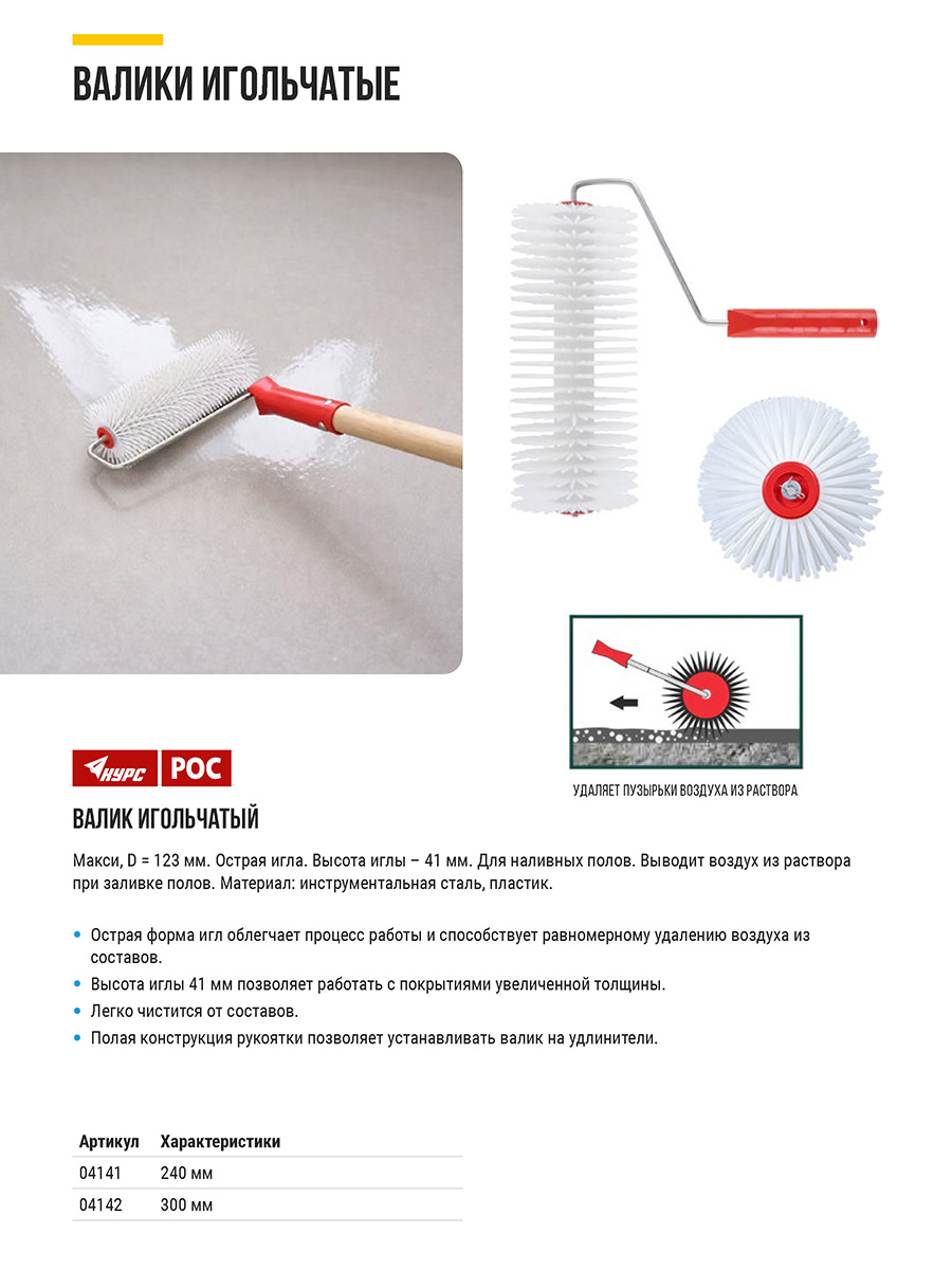 «Макси». D 123 мм. Острая игла. Высота иглы 41 мм. Для наливных полов. Выводит воздух из раствора при заливке полов. Материал: инструментальная сталь, пластик.