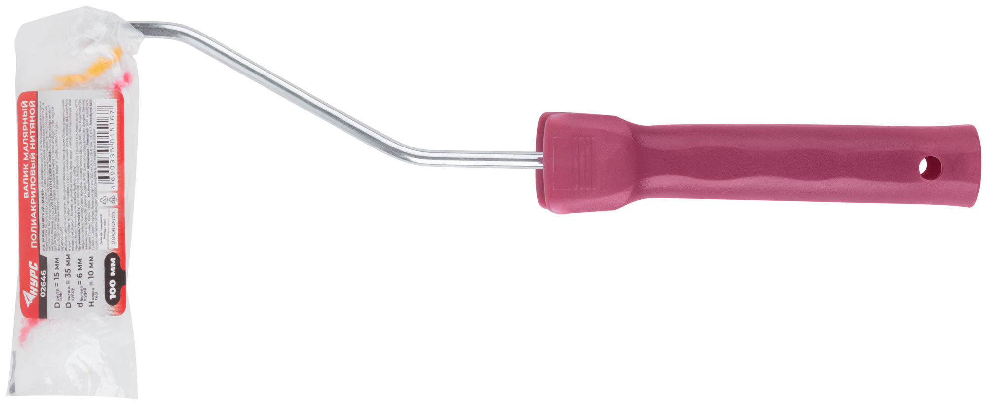 Полиакриловый. Система с пластиковым роликом. Ворс 10 мм, диаметр 15/35 мм, ручка 6 мм. Используется со всеми видами лакокрасочных материалов.