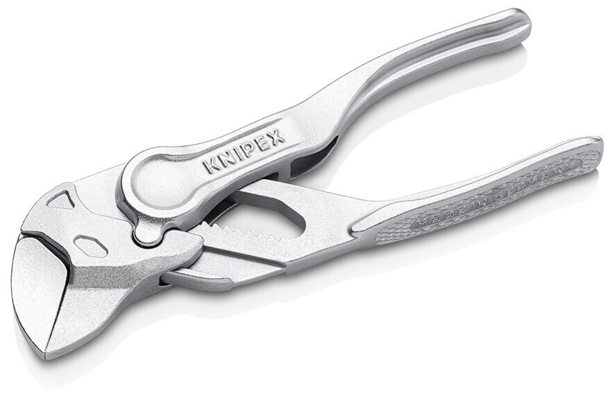 KNIPEX XS расширяет семейство переставных ключей новым компактным инструментом. Это полнофункциональные высокотехнологичные клещи, которые доказывают свой размер, особенно в ограниченном пространстве. Благодаря точной регулировке непосредственно на заготовке, он предлагает одиннадцать установочных положений, которые позволяют зажимать гайки диаметром до 21 мм - и все это при длине всего 100 миллиметров. Благодаря небольшому размеру XS можно удобно использовать одной рукой.