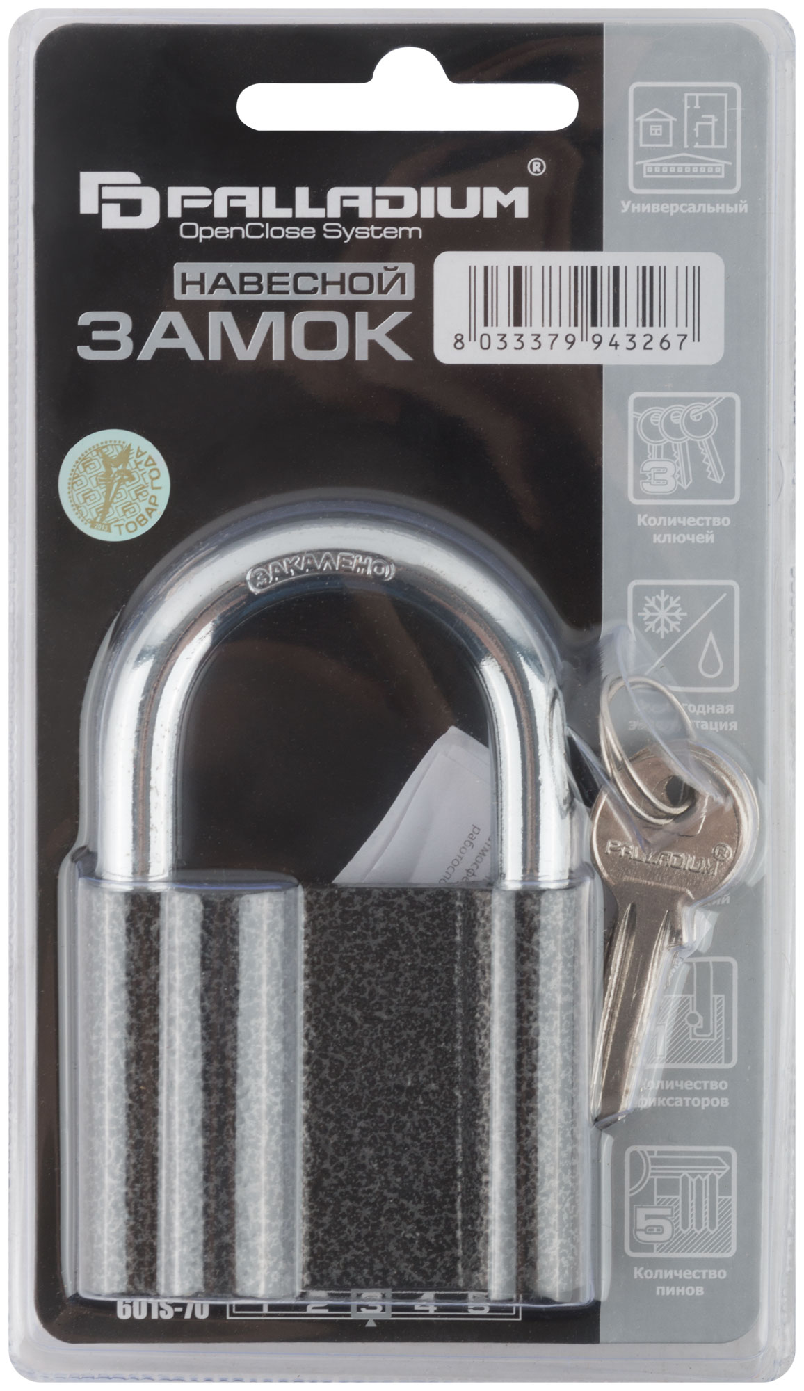 Замок навесной стальной корпус "PALLADIUM" ( 601S ) 70х54 мм, стальная дужка 11 мм