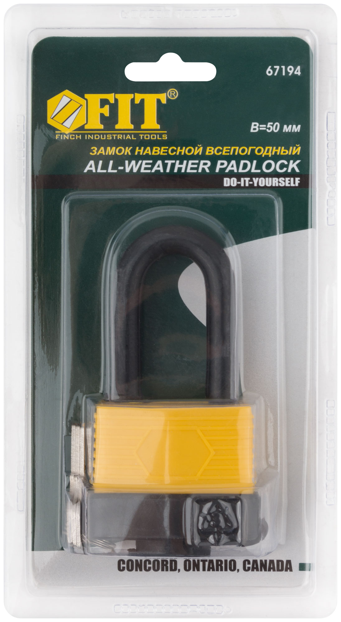 Всепогодный. Автоматическое запирание. Материал: инструментальная сталь, пластик. 3 ключа. С длинной дужкой. Пластиковый чехол на корпусе и специальная заглушка отверстия для ключа предохраняет замок от ржавчины. Упаковка: блистер.