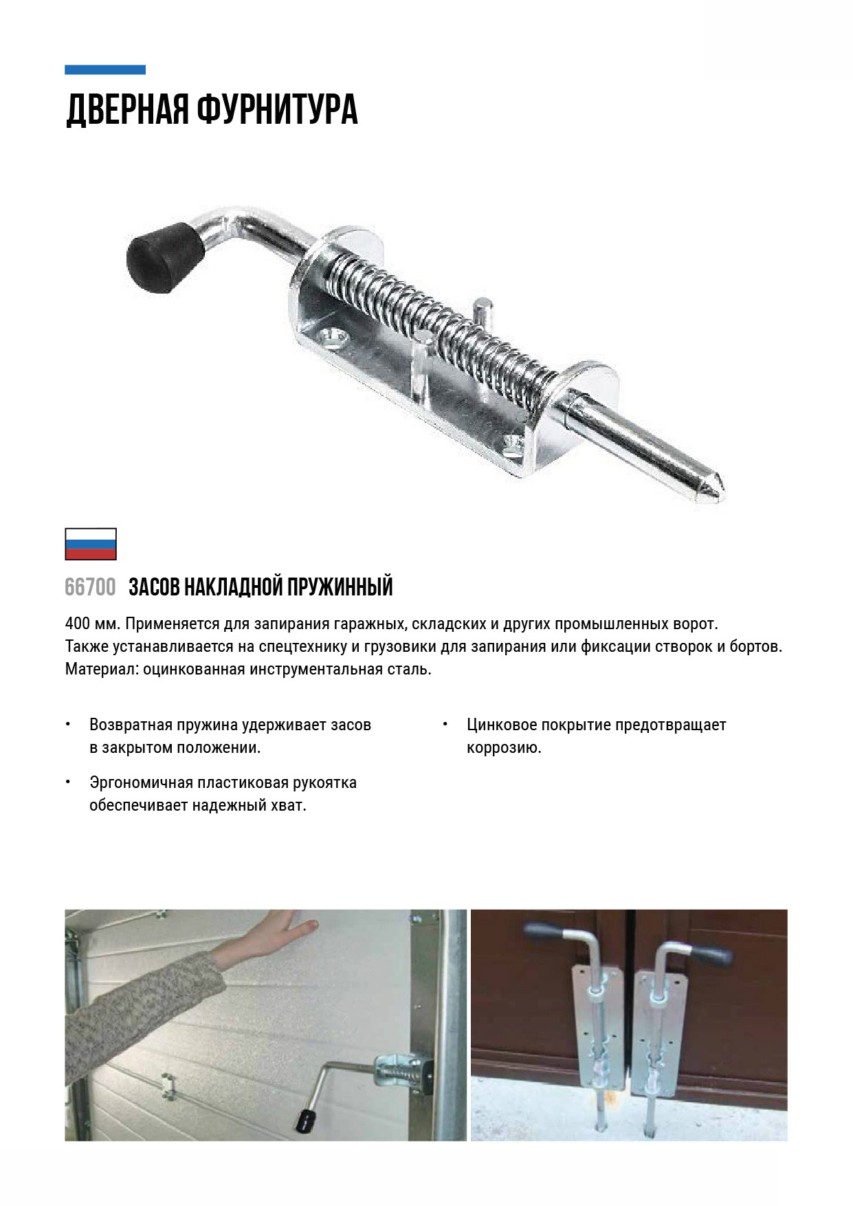 Применяется для закрывания гаражных, складских и других промышленных ворот, также устанавливается на створки и борта спецтехники и грузовиков, для их запирания или фиксации. Материал: оцинкованная сталь.