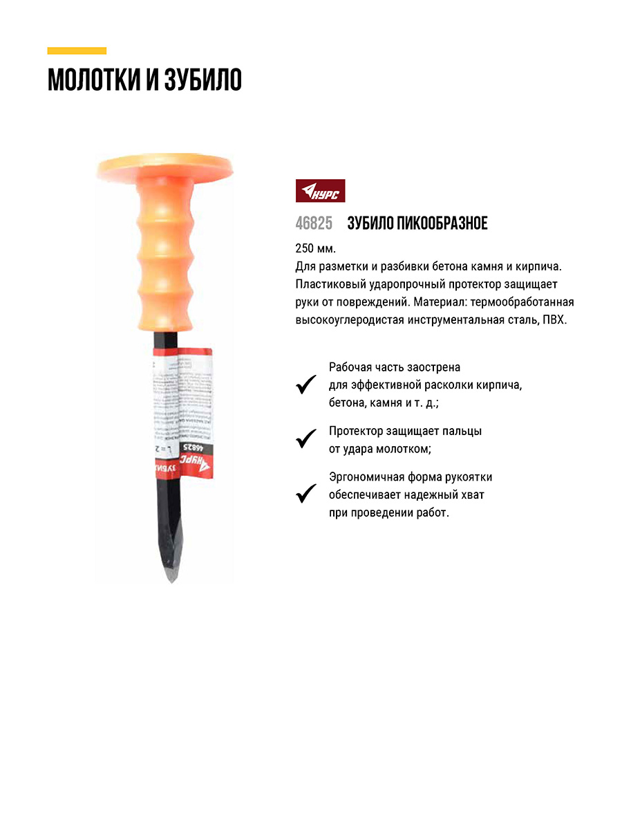 Для разметки и разбивки бетона, камня и кирпича. Пластиковый ударопрочный протектор защищает руки от повреждений. Материал: высокоуглеродистая сталь, ПВХ.