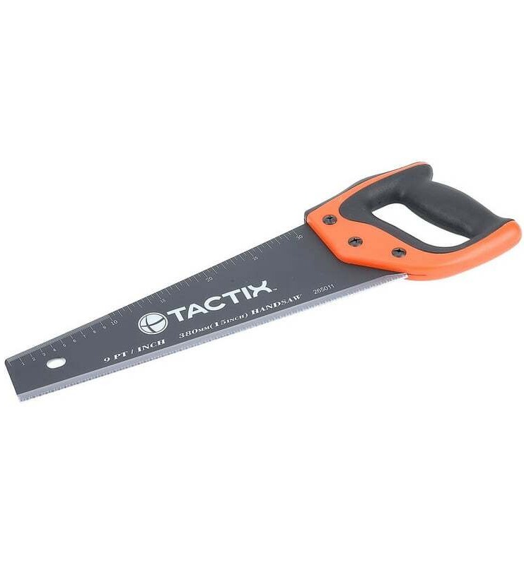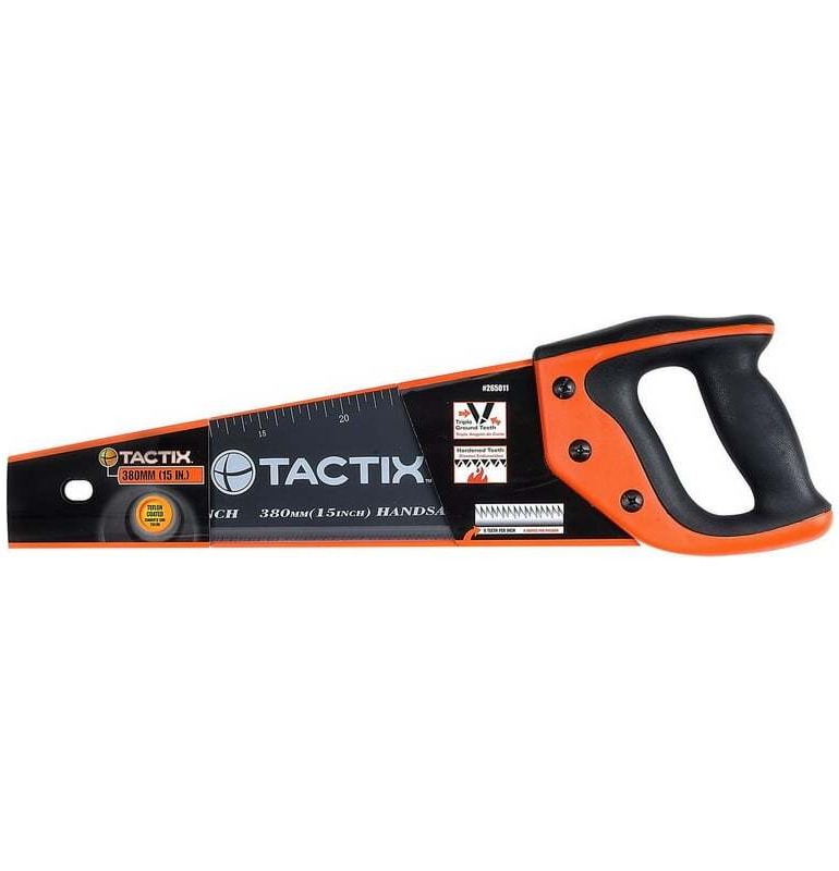 Ножовка по дереву TACTIX 380 мм, с покрытием, зуб 7/8 265011 используется для распила древесины. Полотно ножовки выполнено из инструментальной высококачественной стали, что обеспечивает прочность и долгий срок службы. Зубья закалены для максимально точного реза. Двухкомпонентная эргономичная рукоятка обеспечивает комфортную эксплуатацию. Покрытие полотна PTFE (Тефлон) служит для уменьшения трения. Метрическая линейка на полотне используется для быстрых измерений во время работы.