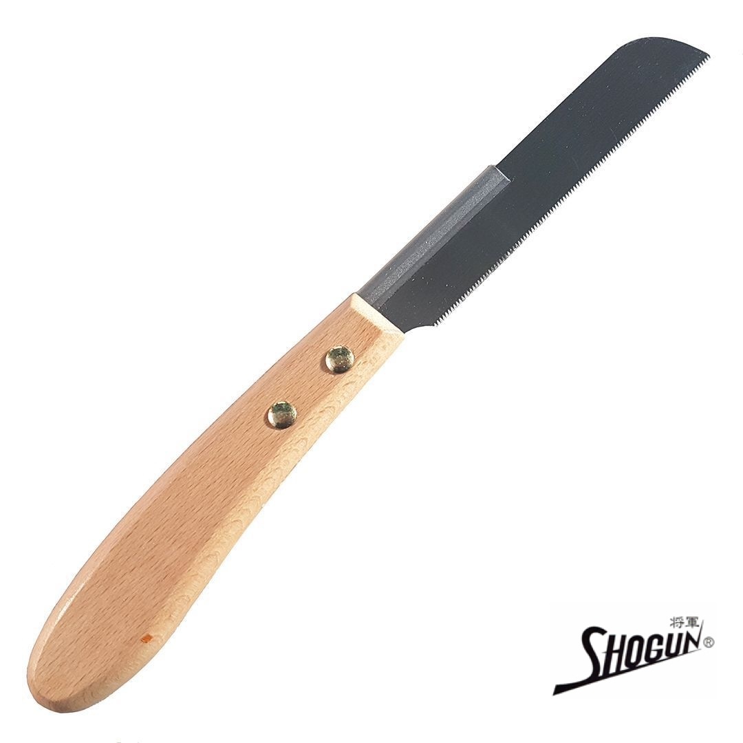Прецизионная пила Shogun предназначена для высокоточных экстра мелких работ по дереву. Зубья направлены к рукояти, что позволяет легко запилить и получать ровный рез не требующей дополнительной обработки. Имеют небольшой обушок длиной в половину лезвия. Шаг зубьев - 28 зубьев на дюйм. Высота пропила в зоне обушка - 14мм. Длина полотна: 120 мм. Толщина полотна 0.3 мм, толщина пропила 0.45 - 0.5 мм небольшой развод зуба. Полотно не сменное, установлено в деревянную ручку из бука с помощью заклепок. Производство - Shogun (Япония.)