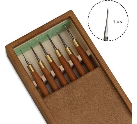 Набор для резьбы по дереву Петроградъ N19, 6 предметов М00020803 представляет собой авторский набор мини-стамесок для миниатюрной резьбы по дереву. Эти прекрасные инструменты подойдут для моделистов, любителей миниатюрной резьбы и для максимальной деталировки резьбы. Набор включает три плоские прямые стамески, две косые стамески и одну полукруглую стамеску.