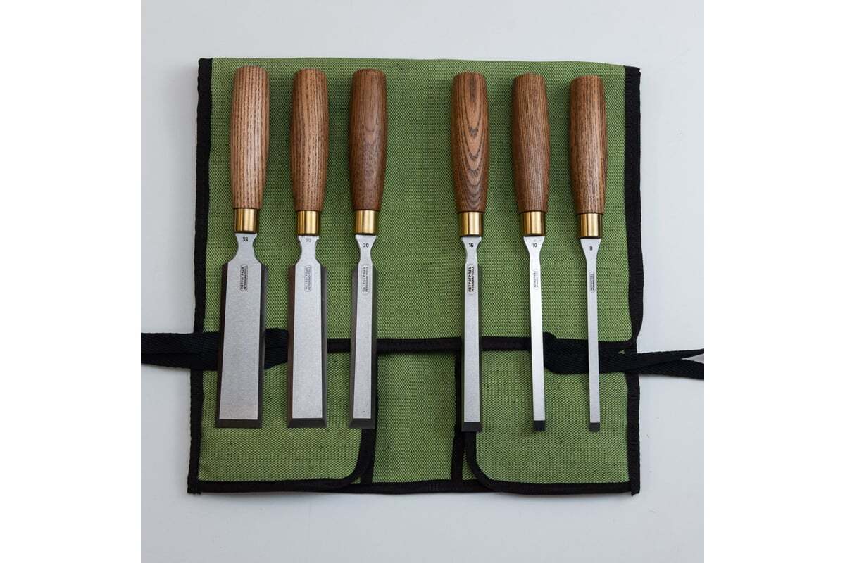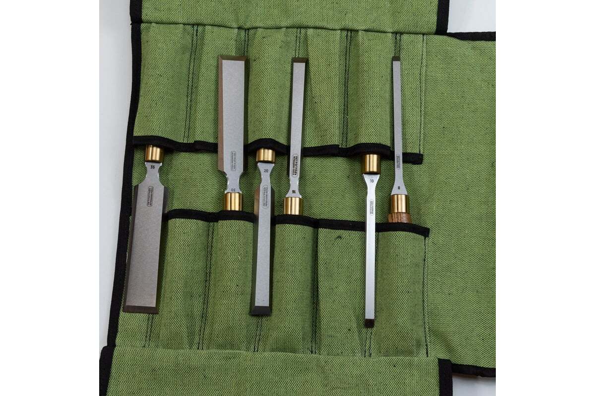 Набор стамесок Петроградъ серия Волга, 6 штук, 8, 10, 16, 20, 30, 35 мм, в сумке-скрутке М00021115 подходит для широкого спектра работ. В набор помещены самые востребованные размеры стамесок: 8, 10, 16, 20, 30, 35 мм. Полотно изготовлено из инструментальной легированной стали и закалено до твердости 59-61HRc. Спинка столярной стамески или рабочая сторона выровнена на плоскошлифовальных станках. Деревянная рукоять выполнена из твердых пород древесины, усилена латунным кольцом для силовой работы с киянкой.