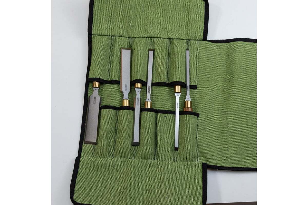 Набор поставляется в тканевой сумке-скрутке. Полотна стамесок смазаны защитным инструментальным воском, перед работой воск необходимо стереть сухой тряпкой или бумажным полотенцем.