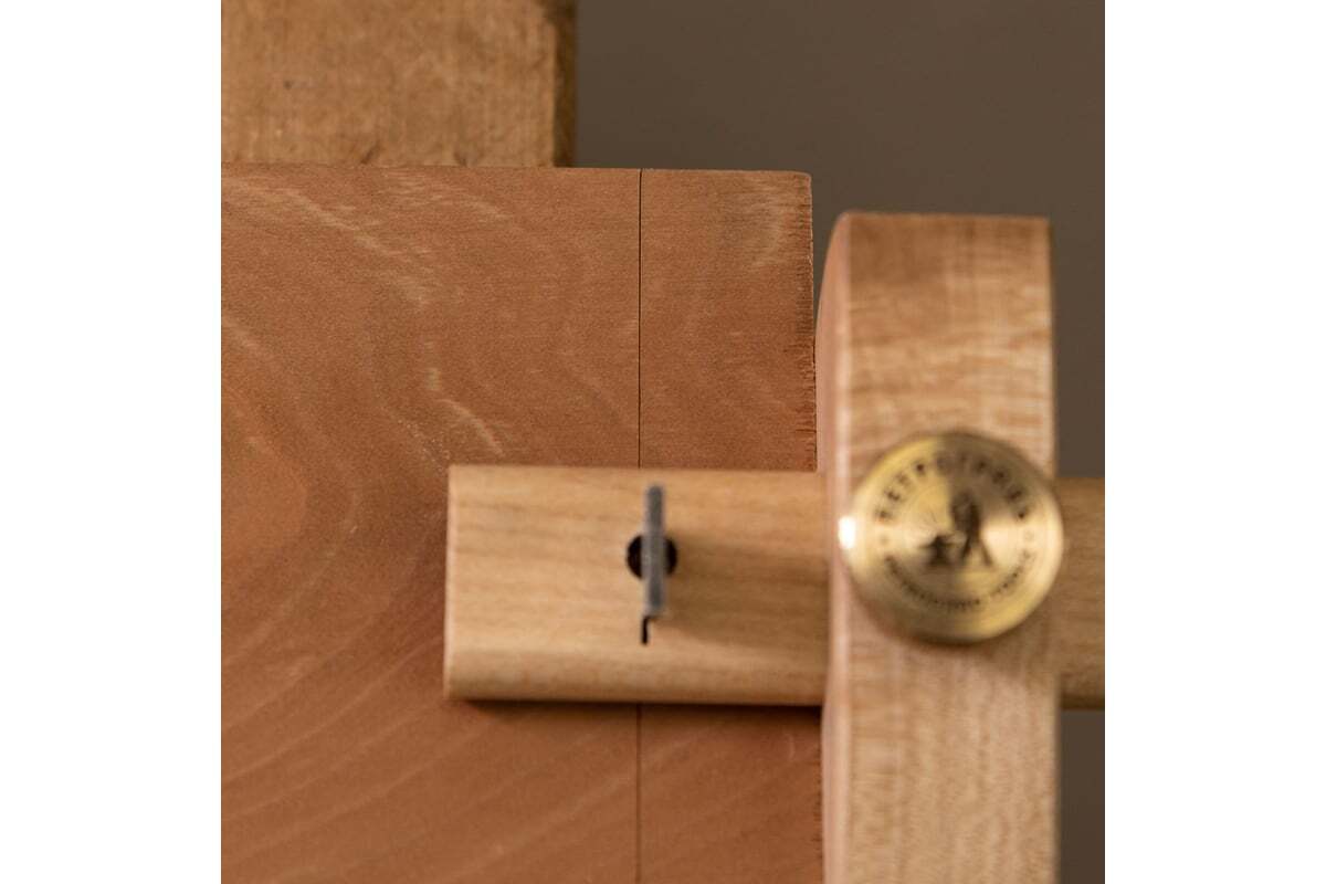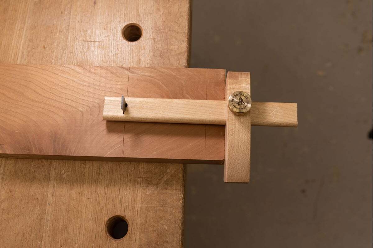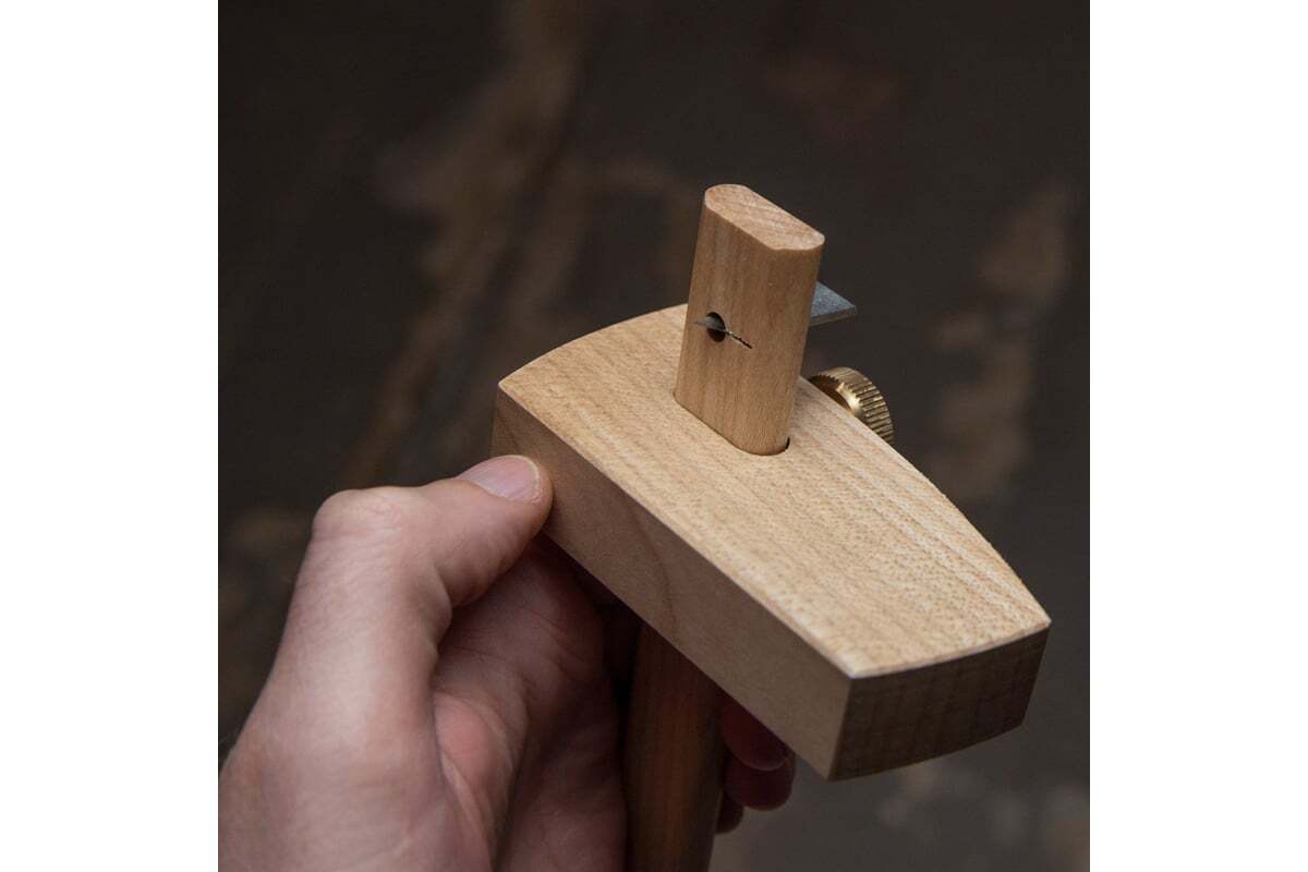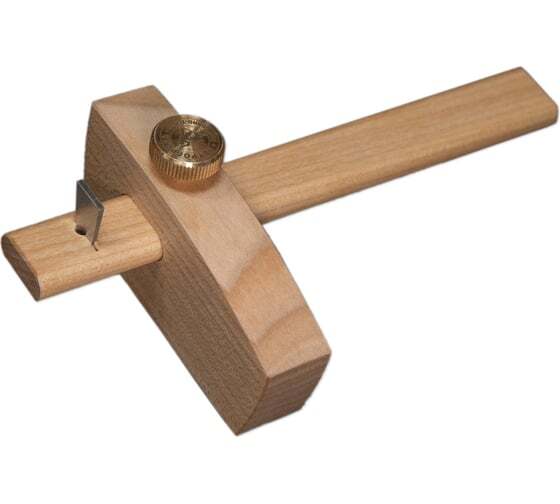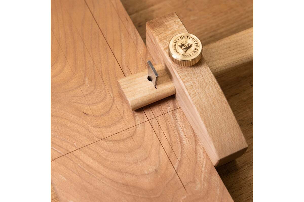 Колодка и штанга рейсмуса выполнены из древесины клена, штанга фиксируется латунным винтом. При разметке рейсмус удобно ложиться в руку, работает мягко и точно. При необходимости нож инструмента можно извлечь и заточить.