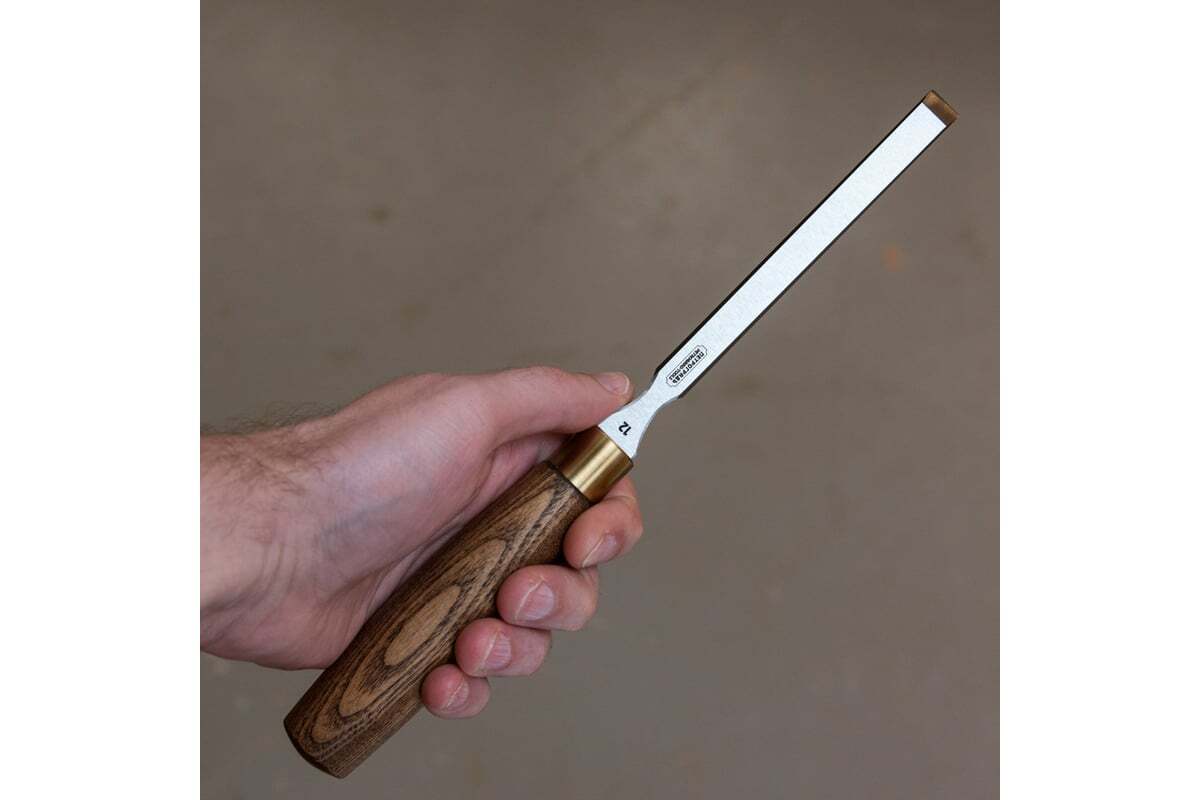 Толщина лезвия переменная и увеличивается от режущей кромки к рукояти. Угол заточки режущей кромки составляет 25 градусов. Угол наклона бокового скоса стамески составляет 55 градусов. Полотно выполнено из качественной стали и закалено до твердости 59-61HRc.