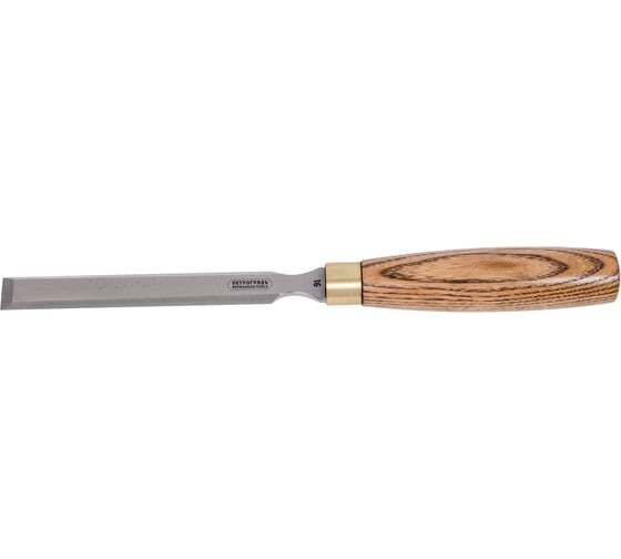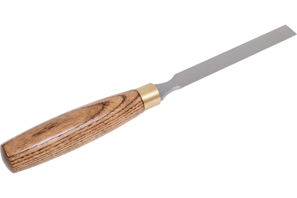 Стамеска заточена и готова к работе. Деревянная рукоять выполнена из твердых пород древесины, усилена латунным кольцом для силовой работы с киянкой.