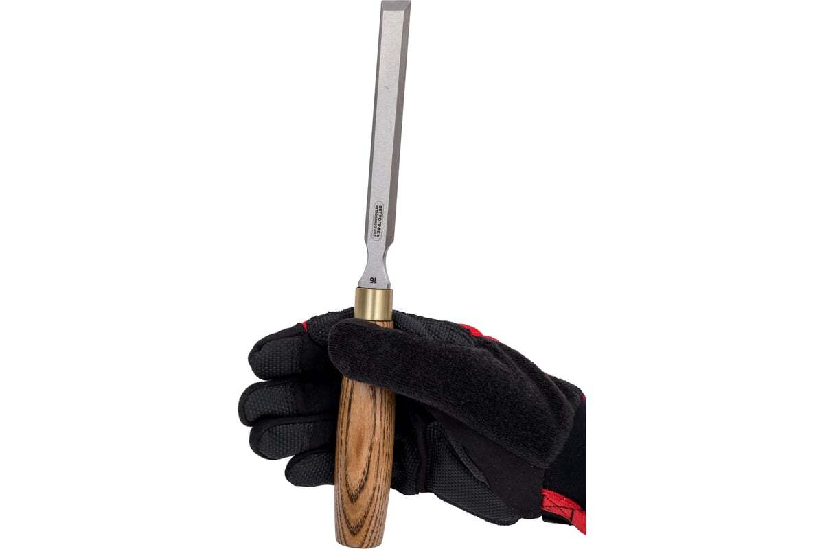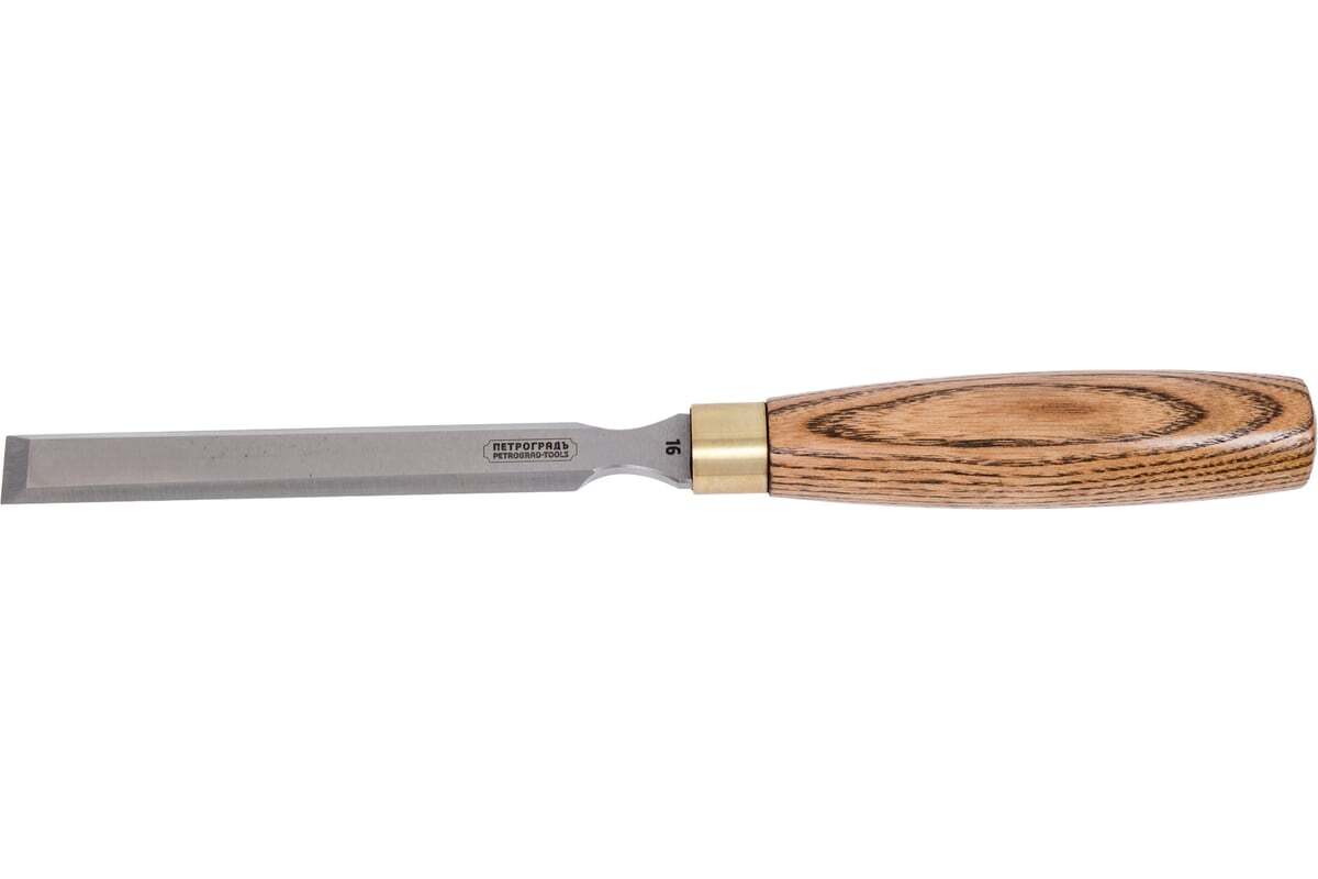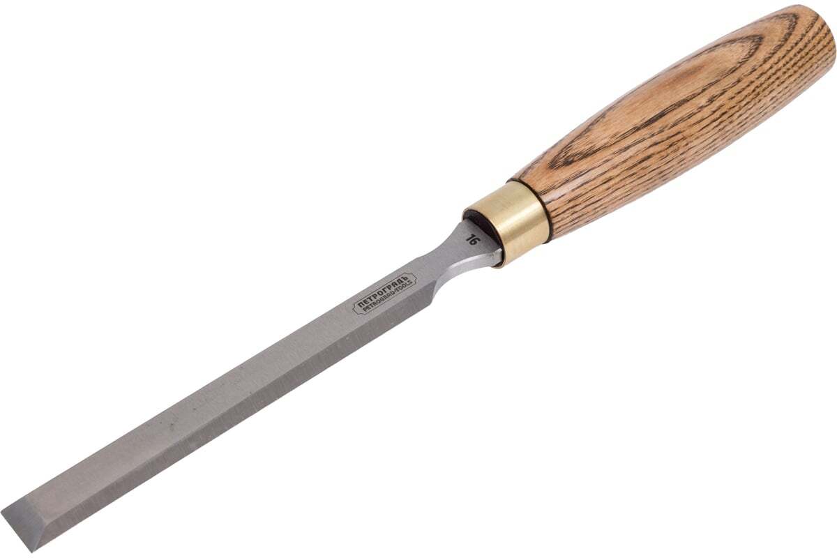 Стамеска Петроградъ серия Волга, 16 мм М00019119 используется для работ по дереву. Форма лезвия стамески имеет боковые скосы для работы в труднодоступных местах, например при подрезке и подчистки шиповых соединений: ласточкин хвост, шип-проушина и т.д. Спинка столярной стамески или рабочая сторона выровнена на плоскошлифовальных станках.
