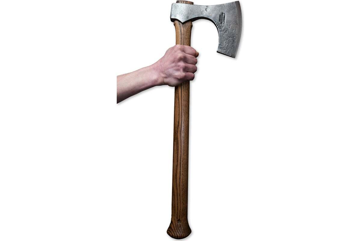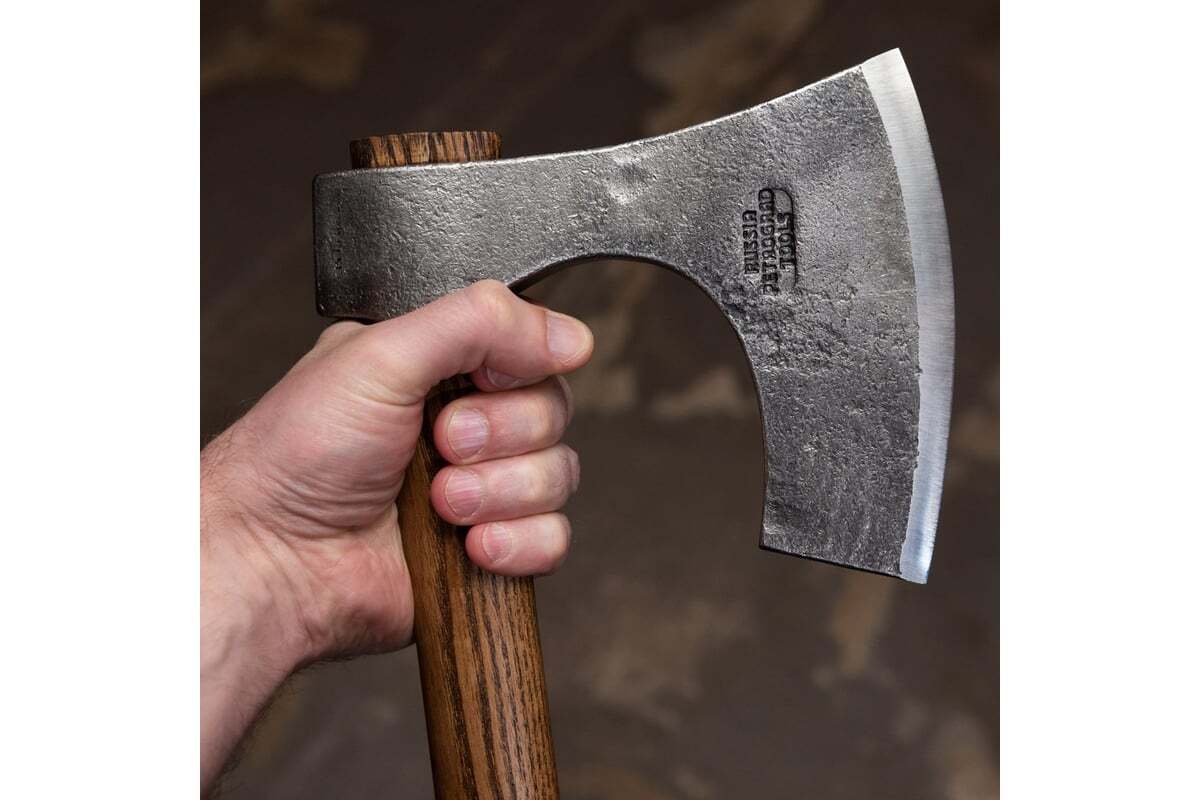 Кованый топор Петроградъ Рославль 10 топорище н2 М00015751 отличается от других топоров удлиненной режущей кромкой. Благодаря этой особенности топор можно брать близким к полотну хватом и не бояться поранить руку при работе. Такой хват очень удобен при тёске и ошкуривании бревен. Удлиненная рукоять позволяет без лишних усилий рубить ветки, сучья и небольшие деревья.