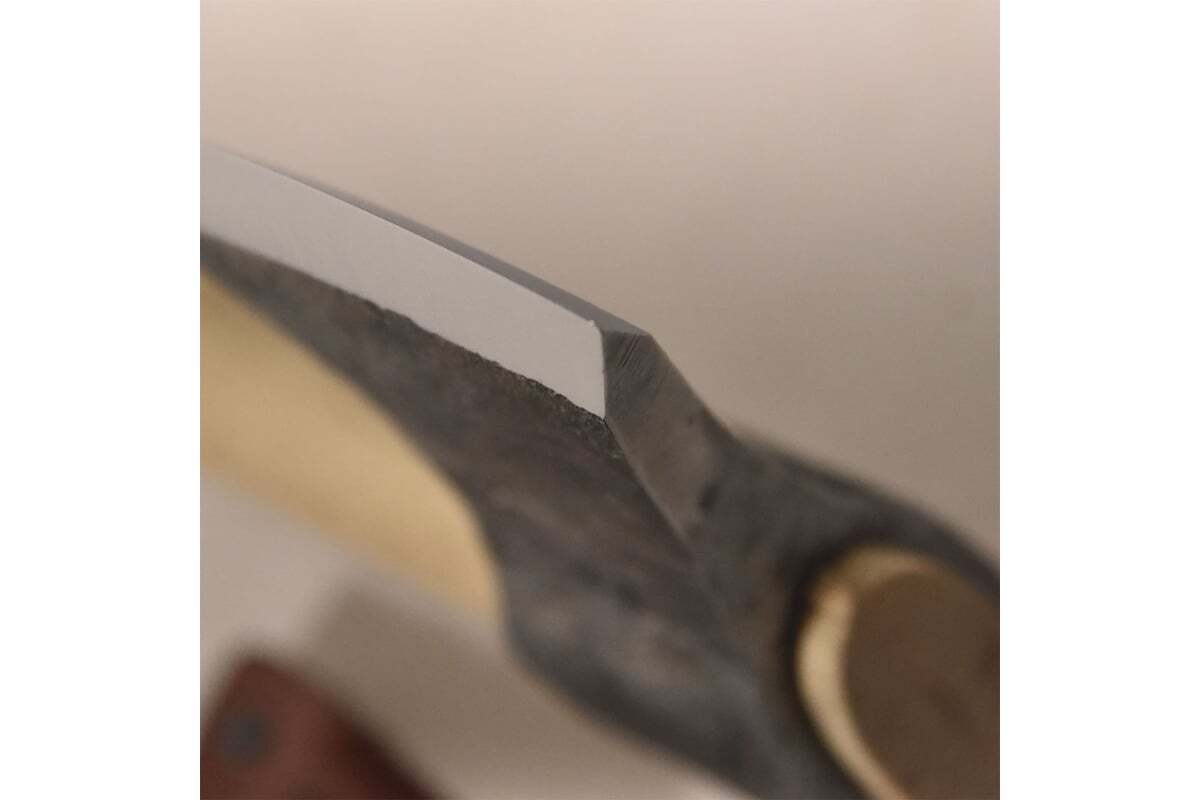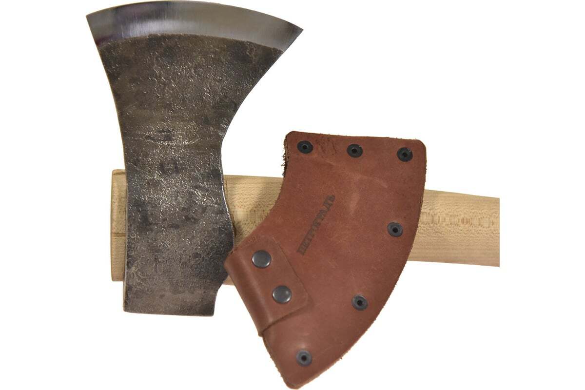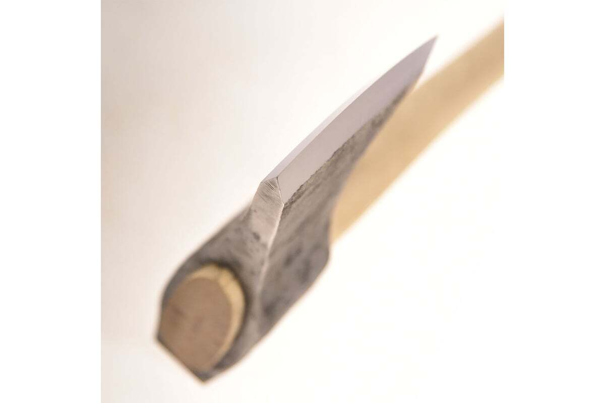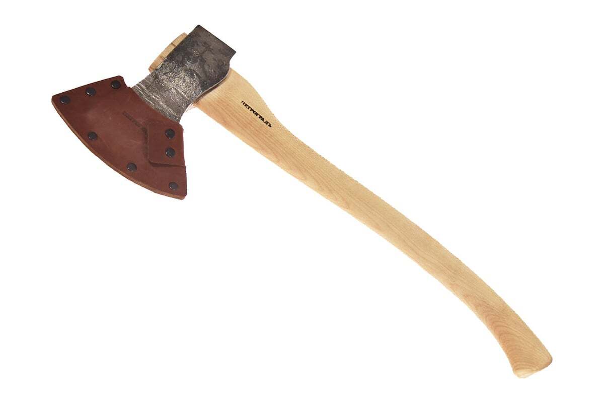 Топор выкован вручную из инструментальной легированной стали, закален до твердости 55-57HRc. Угол заточки - 40 градусов.