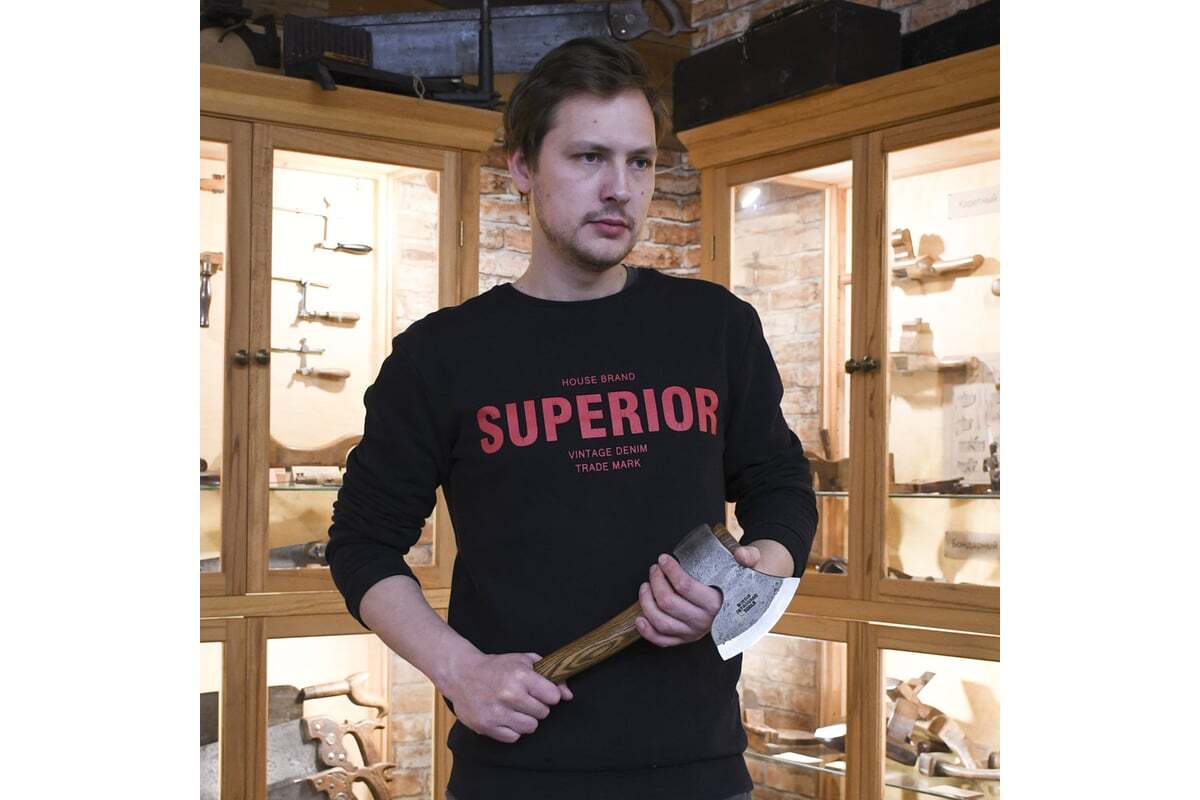 Топор выкован вручную из конструкционной рессорно-пружинной стали, закален до твердости 55-57 HRc.