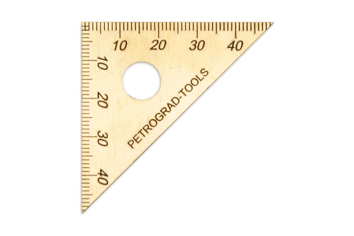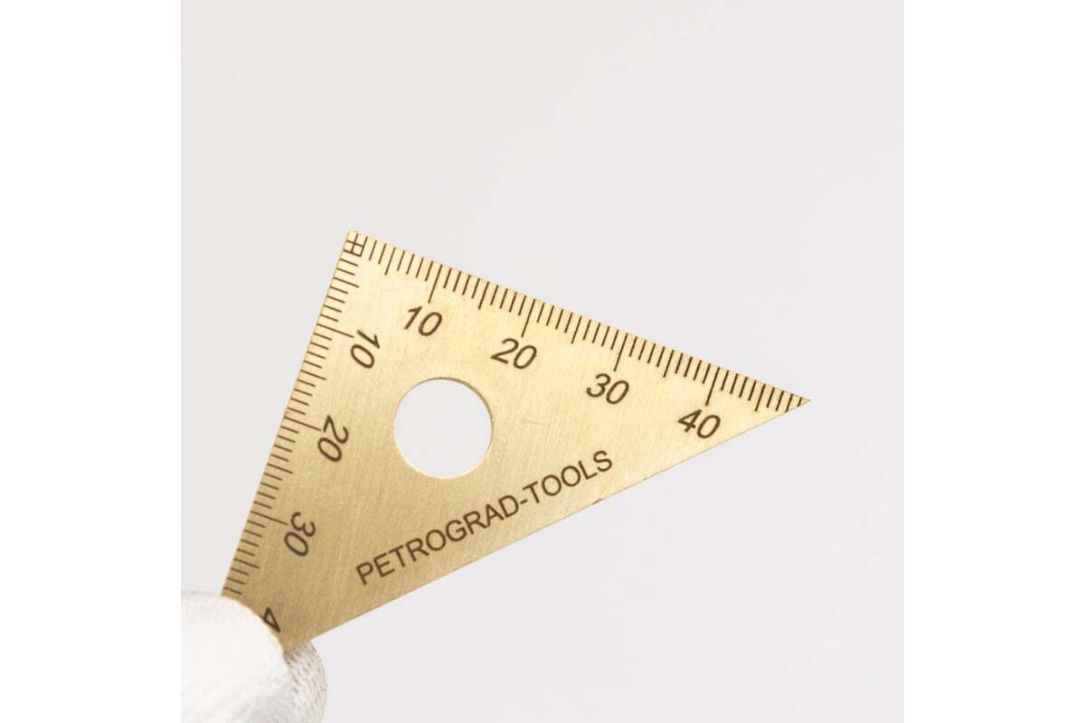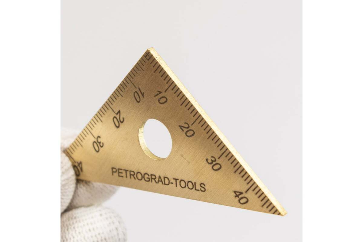 Разметочный плоский угольник Петроградъ 90x45x45 М00020969 для разметки и черчения углов в 90 градусов и 45 градусов. Это небольшой чертежный угольник в форме треугольника с углами 90° 45° 45°, таким угольником удобно проверять небольшие изделия на соответствие заявленным углам.