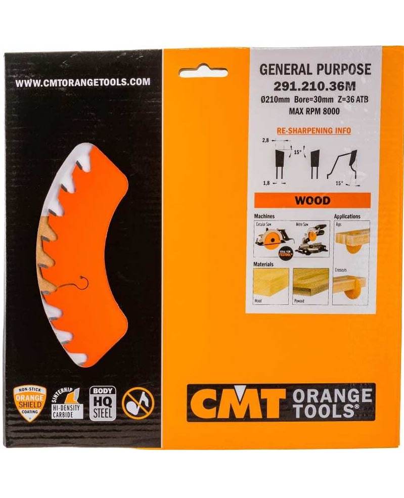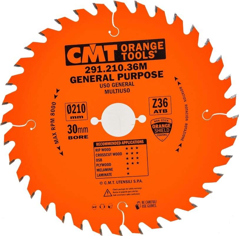 Пильный диск CMT 291.210.36M является универсальным. Его используют как для продольного, так и поперечного пиления древесины и фанеры. Диск оснащен отверстиями для крепления на большинстве инструментов. Зубья оснастки изготовлены из твердого сплава (К10). Благодаря особой конфигурации зубьев при работе данным диском достигается необходимая скорость пиления и эффективность.