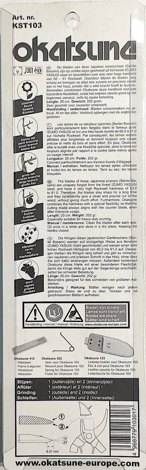 Идеальные секаторы для обрезки фруктовых деревьев, веток, кустов, роз, лиан и пр. Длина секатора - от 180мм до 210мм (для разных по размеру рук). Лезвия длиной 53мм-55мм позволяют без особых усилий перерезать ветки до 25мм. Выполнены из стали IZUMO YASUGI имеет очень высокую твердость по Роквеллу - от 60,0 до 61,0. Благодаря этому лезвия всегда остаются острыми в течении длительного времени. V-образная форма пружины обеспечивает равномерное распределение нагрузки по длине пружины, что обеспечивает плавное закрытие. Заточка режущей грани имеет 2 угла, поэтому ножницы плавно прорезают древесину и не будут излишне травмировать растение. Также этот секатор имеет систему запирания которую легко использовать одной рукой. Производство Okatsune (Япония).