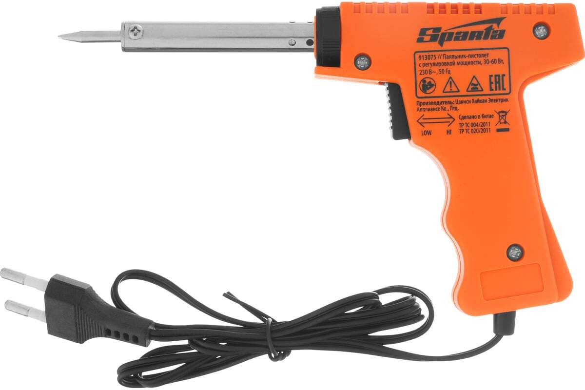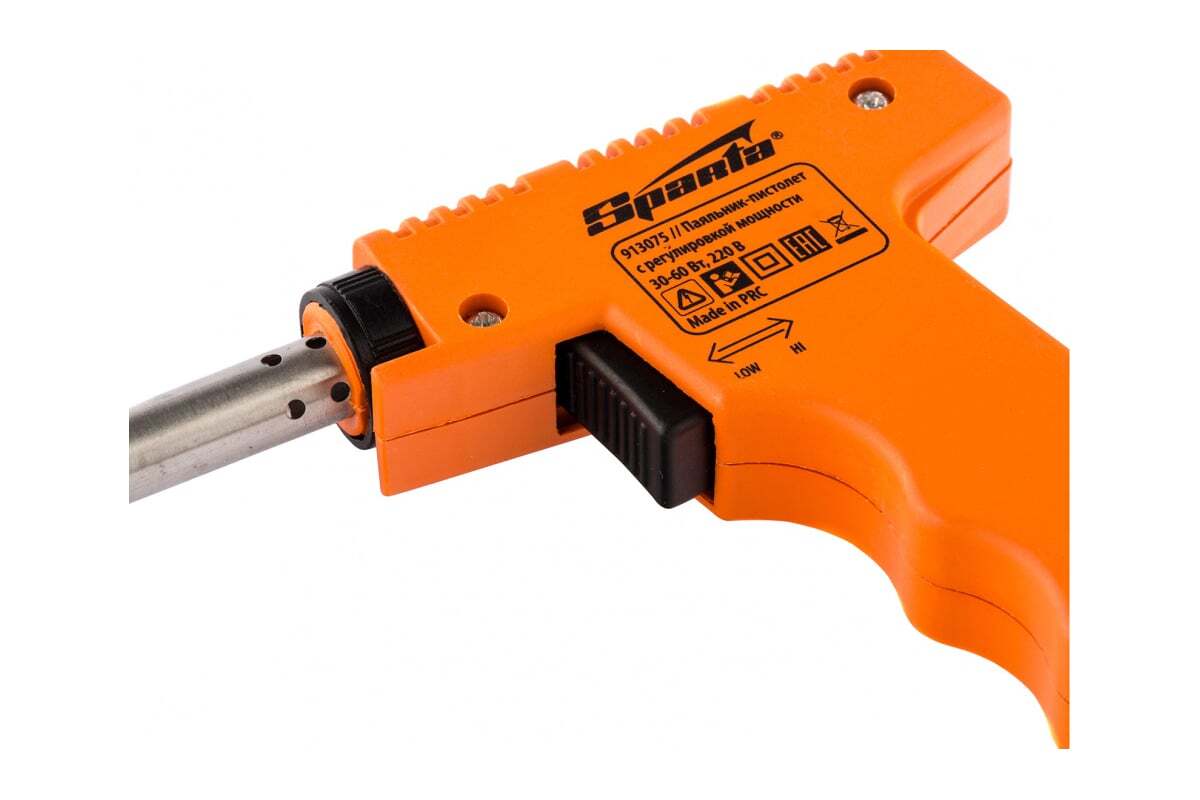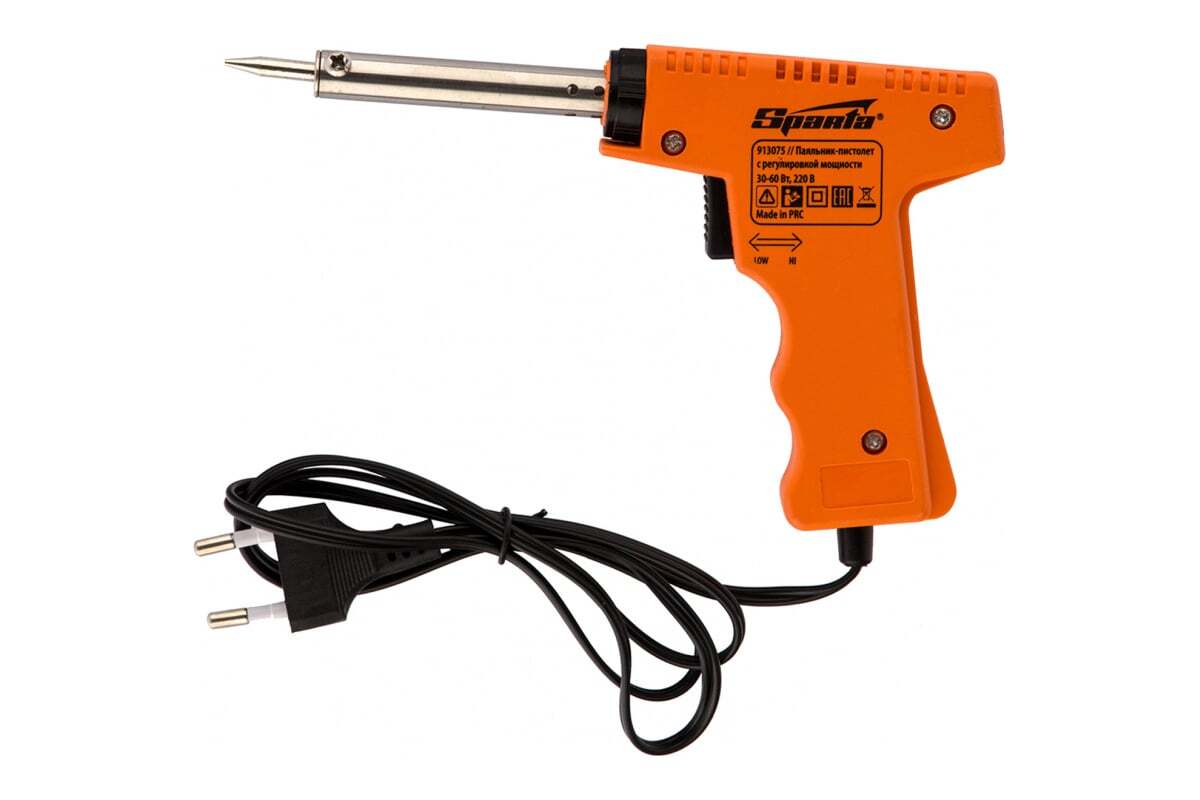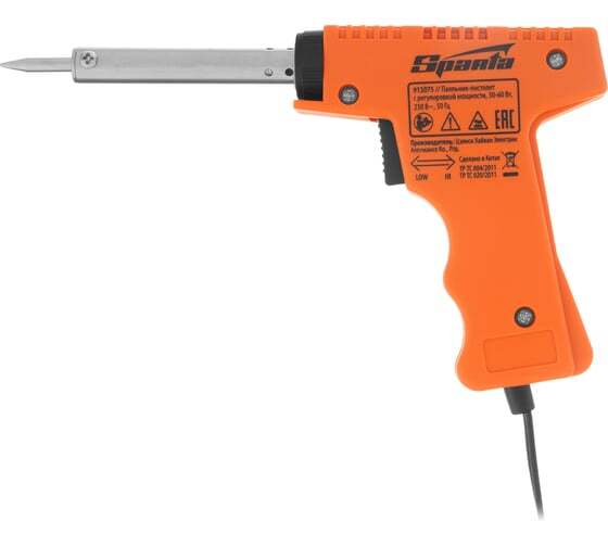 Паяльник-пистолет Sparta 913075 с регулировкой мощности 30-60 Вт питается от сети 220 В и предназначен для пайки микрочипов, транзисторов, электросхем, кабелей. Благодаря керамическому нагревательному элементу подходит для длительной непрерывной работы. Съемное жало может быть заменено в случае необходимости. Температура нагрева регулируется нажатием кнопки на рукоятке. Простой в применении прибор пригодится электромонтерам, радиолюбителям, автоэлектрикам, а также будет полезен в быту.