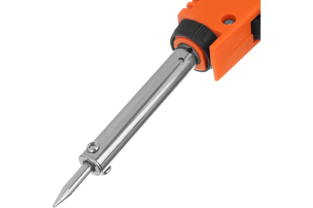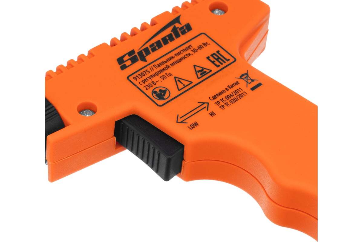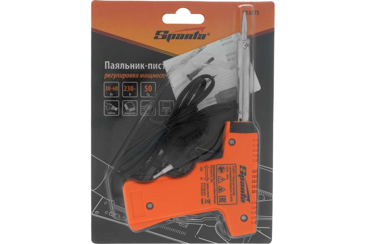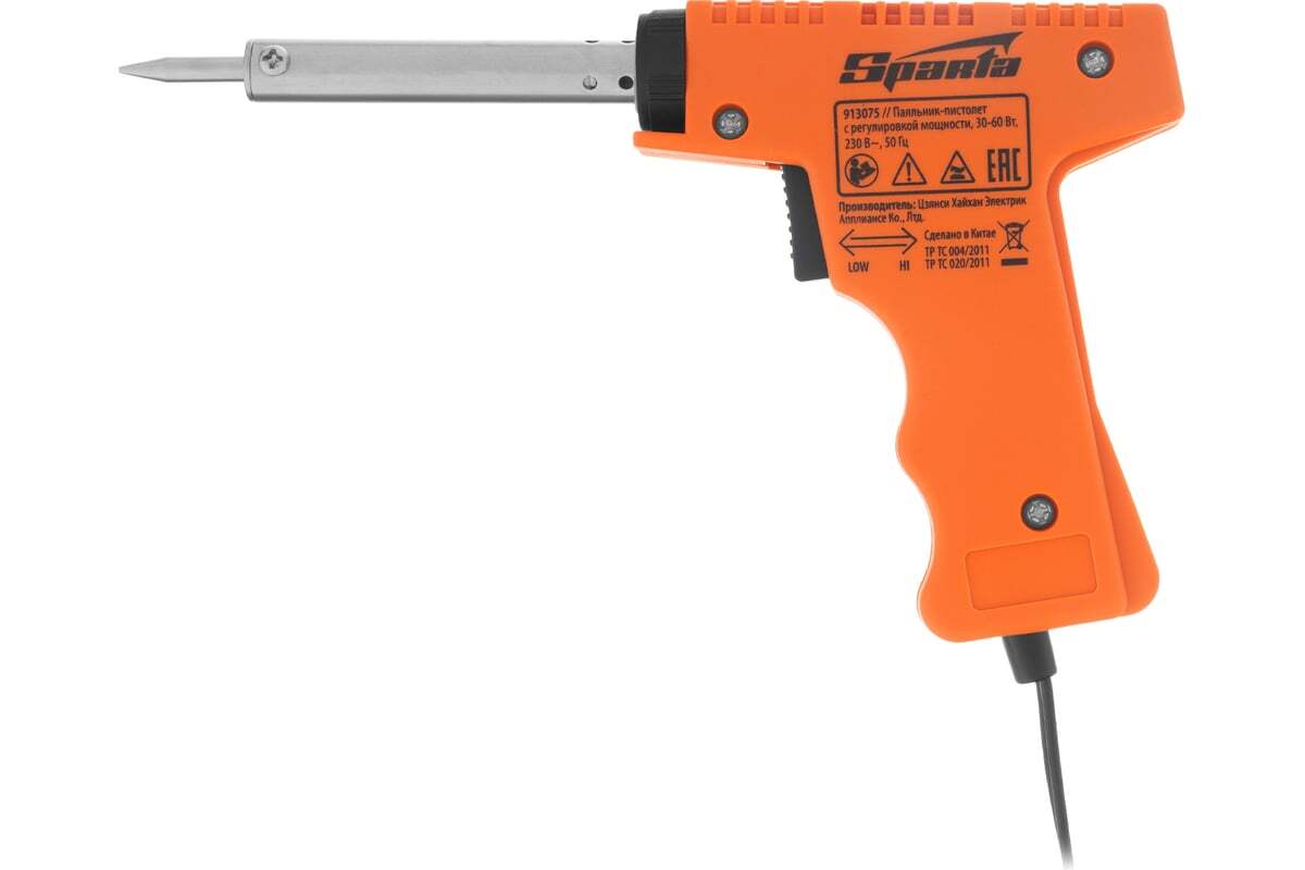 Паяльник-пистолет Sparta 913075 с регулировкой мощности 30-60 Вт питается от сети 220 В и предназначен для пайки микрочипов, транзисторов, электросхем, кабелей. Благодаря керамическому нагревательному элементу подходит для длительной непрерывной работы. Съемное жало может быть заменено в случае необходимости. Температура нагрева регулируется нажатием кнопки на рукоятке. Простой в применении прибор пригодится электромонтерам, радиолюбителям, автоэлектрикам, а также будет полезен в быту.