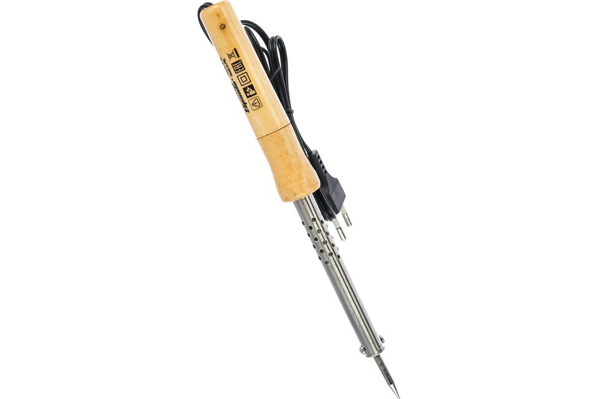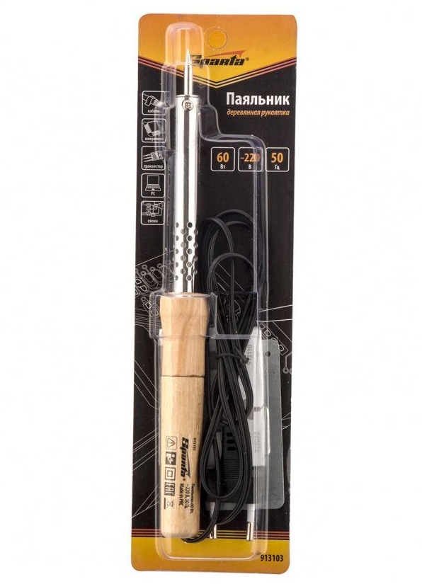 Паяльник Sparta 913103, 60 Вт, 220 В, с ручкой из дерева, используется для пайки электропроводки, микрочипов, электрических схем и транзисторов. Нагревательным элементом является нихромовая спираль, что уменьшает вероятность поломки прибора в результате падения или удара. Конусовидный наконечник позволяет успешно решать поставленные задачи. Жало легко очищается, а в случае выхода из строя его легко можно заменить. Защитное покрытие улучшает прилипание припоя и защищает наконечник от коррозии. Паяльник пригодится для ремонта электроники, бытовой техники, а также обслуживания автомобилей и проведения электромонтажных работ.