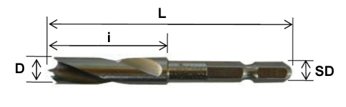 Диаметр рабочей части, D мм | Длина рабочей части, i мм | Общая длина, L мм | Рекомендуемая частота вращения, об/мин | Размер шестигран. хвостовика, SD мм |