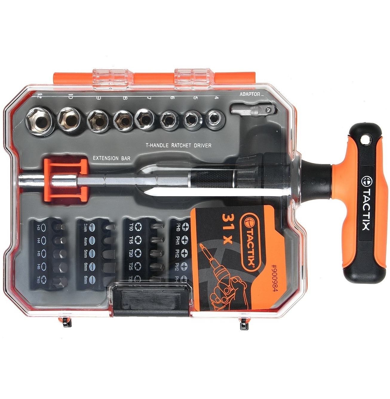Набор головок TACTIX 1/4 и вставок с Т-образной рукояткой из 31-го предмета 900984 используется для работ с резьбовыми соединениями в процессе ремонта и монтажа. Вставки и головки выполнены из хромованадиевой стали, что обеспечивает надежность и долговечность. Эргономичная рукоятка с храповым механизмом выполнена с учетом анатомических особенностей ладони, благодаря чему подходит для продолжительной работы без усталости руки. Набор поставляется в пластиковом кейсе для удобного хранения и транспортировки.