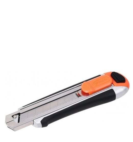 Нож используется для резки различных материалов. Конструкция выполнена из сплава алюминия и нержавеющей стали, благодаря чему отличается прочностью и долговечностью. Мягкая накладка на рукоятке обеспечивает комфортную работу. Функция быстрой смены лезвия облегчает использование. Конструкцией предусмотрено приспособление для откусывания затупленных сегментов. В комплекте поставляются 3 лезвия с отламывающимися сегментами шириной 18 мм.