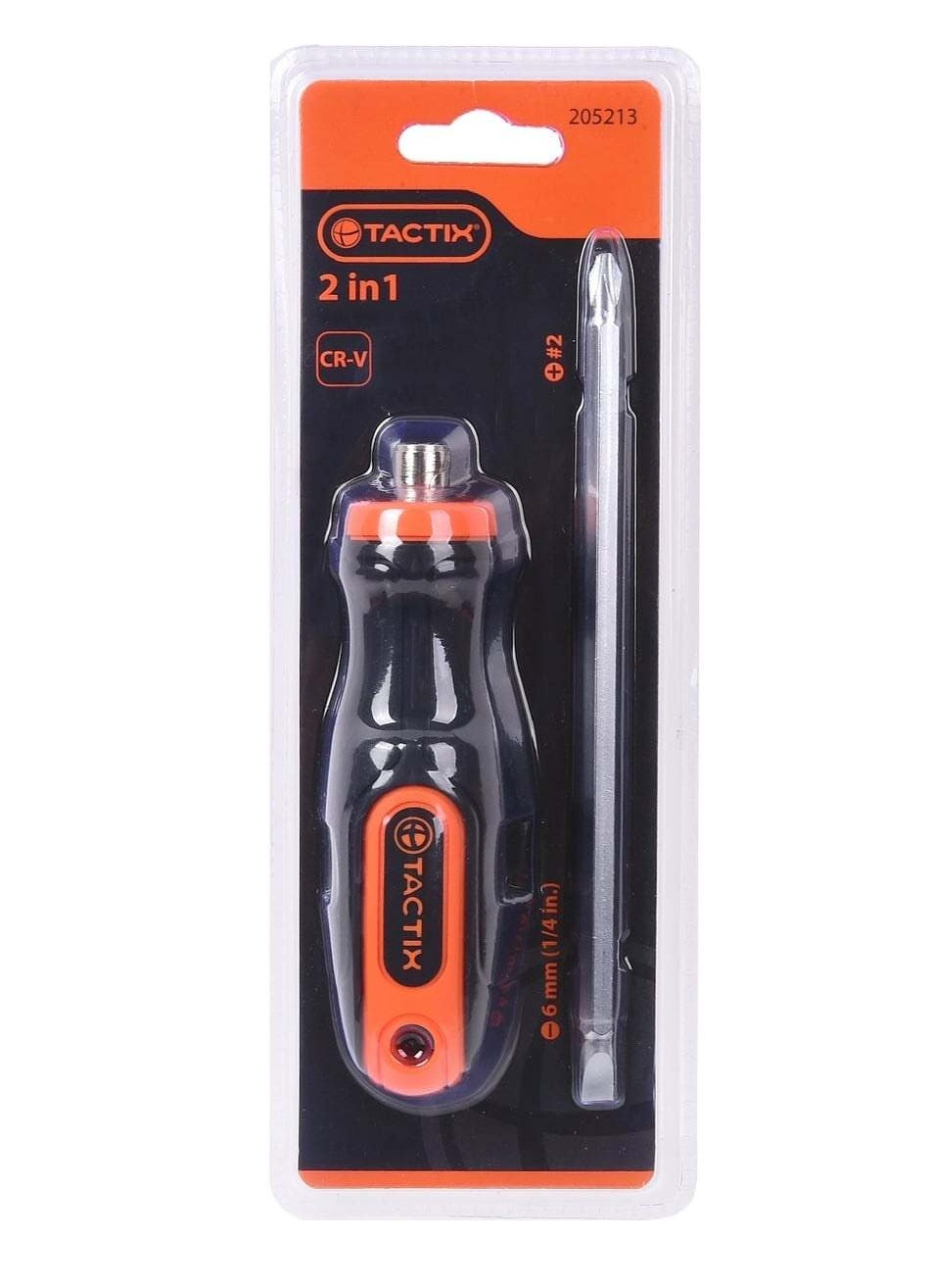 Отвертка TACTIX ERGO 2 в 1, шлиц 6x125 мм, РН2x125 мм 205213 используется для работ с резьбовыми соединениями в процессе ремонта и монтажа. Двухкомпонентная рукоятка двухкомпонентная Ergo снижает нагрузку на руку во время работы. Вставки изготовлены из качественной хромованадиевой стали и долго прослужат даже при значительных нагрузках. Подходит для профессионального и бытового использования.