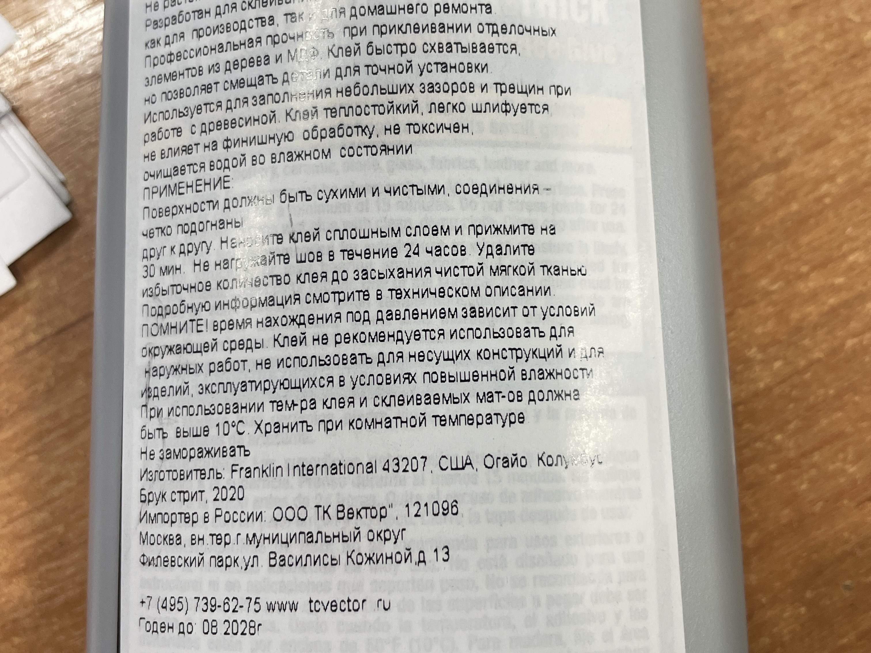 Клей Titebond Quick & Thick Multi-Surface Glue не рекомендуется для наружного применения или в местах с повышенной влажностью. Для наружного применения следует использовать клей Titebond III Ultimate Wood Glue ИЛИ Titebond II Premium Wood Glue. Не подходит для деревянных строительных конструкций, несущих нагрузку. Одна из склеиваемых поверхностей должна быть пористой или полупористой. Не рекомендуется для фотографий, стирающихся предметов одежды, металлов, пластика и резины. Не применять при температуре воздуха, клея или материалов ниже +10 ˚С. Замораживание продукта не влияет на его клеящие свойства, но может вызвать его загустение. Клей следует размешать, чтобы вернуть его в первоначальное состояние. Перед применением ознакомьтесь с Паспортом безопасности вещества. При использовании для дерева перед окрашиванием тщательно зашлифуйте место склеивания. Хранить при комнатной температуре. НЕ ДОПУСКАТЬ ЗАМОРАЖИВАНИЯ. ХРАНИТЬ В МЕСТАХ, НЕДОСТУПНЫХ ДЛЯ ДЕТЕЙ.