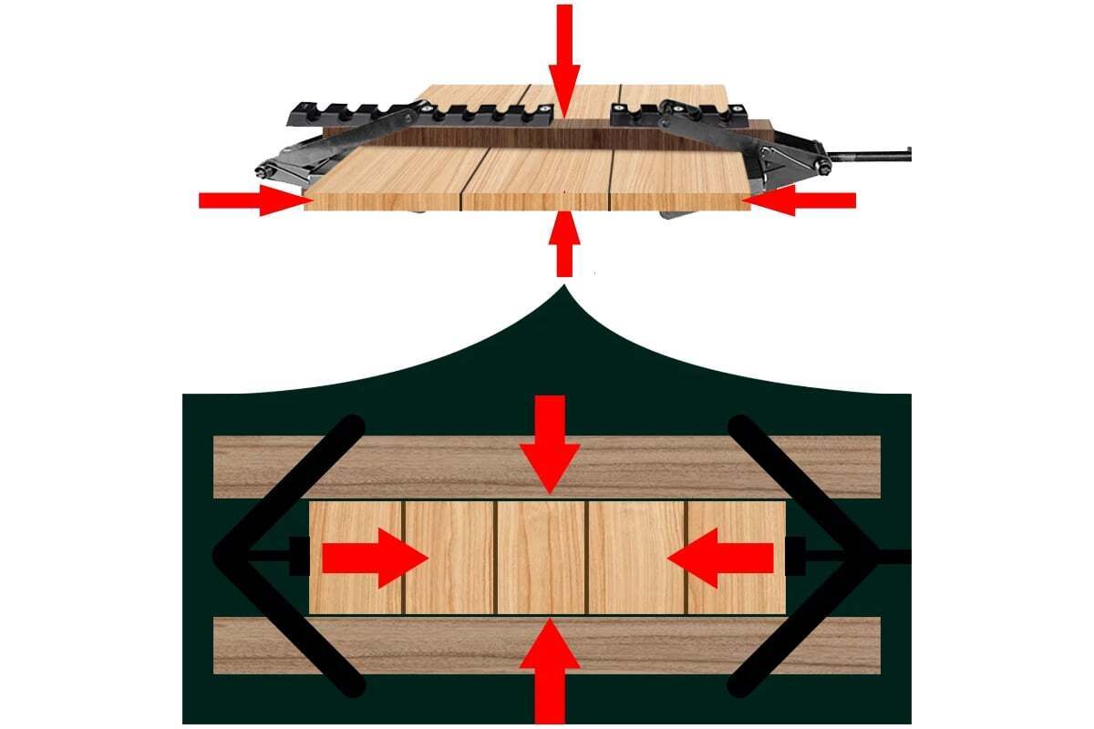 • благодаря использованию заготовка остается плоской и предотвращает перекручивание досок при склеивании благодаря одинаковому давлению со всех четырех направлений (сверху, снизу и с обеих сторон)