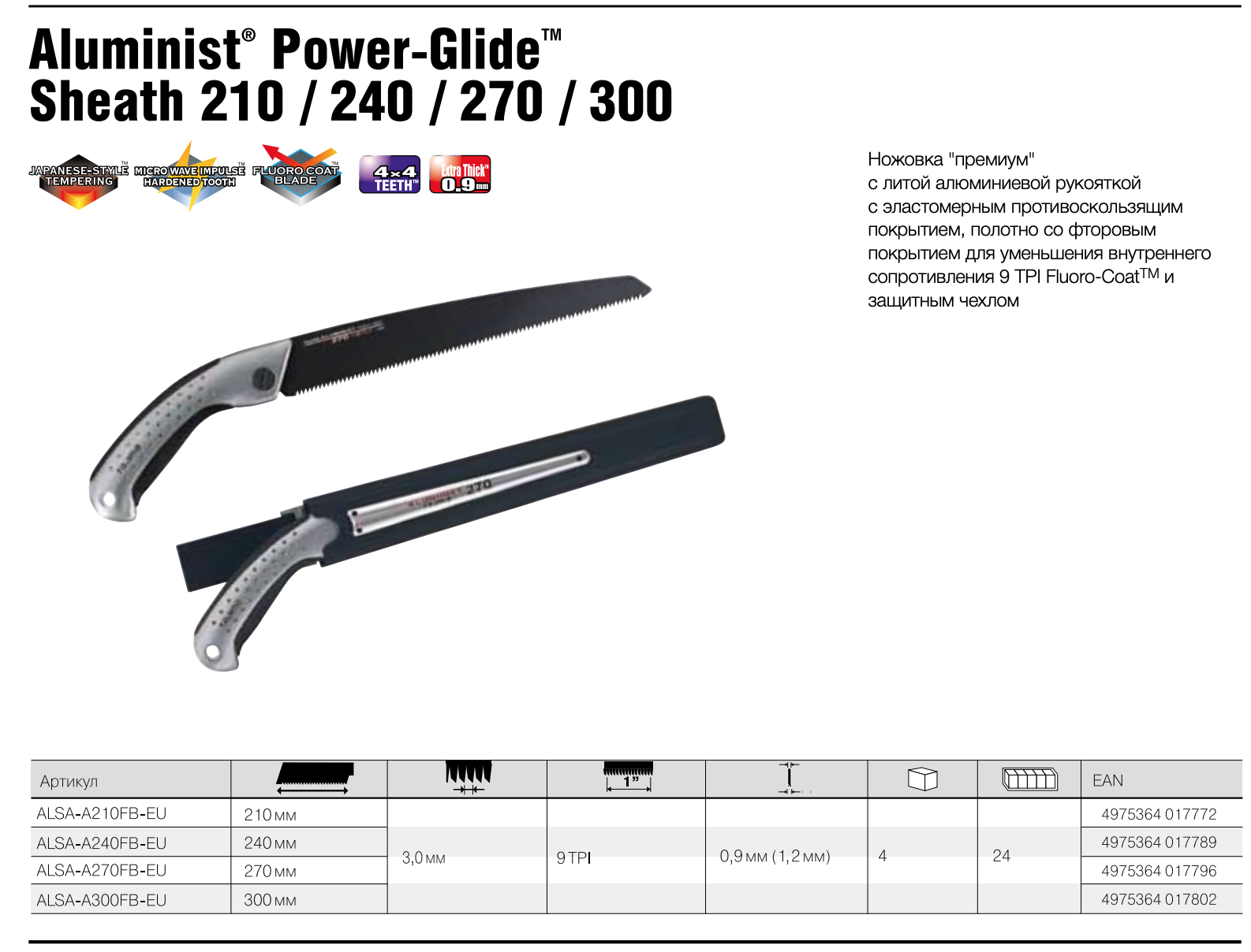 - Ножовка "премиум" c литой алюминиевой рукояткой с эластомерным противоскользящим покрытием, полотно со фторовым покрытием для уменьшения внутреннего сопротивления 9 TPI Fluoro-Coattm и защитным чехлом