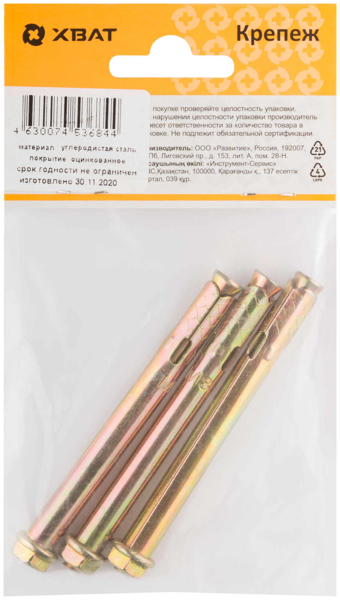 Втулка, шпилька с конусом и гайка изготовлены из стали с электроцинкованным покрытием желтого цвета. Применяется для крепления различных тяжеловесных конструкций в полнотелых материалах (бетон, корпич, естественный камень).
