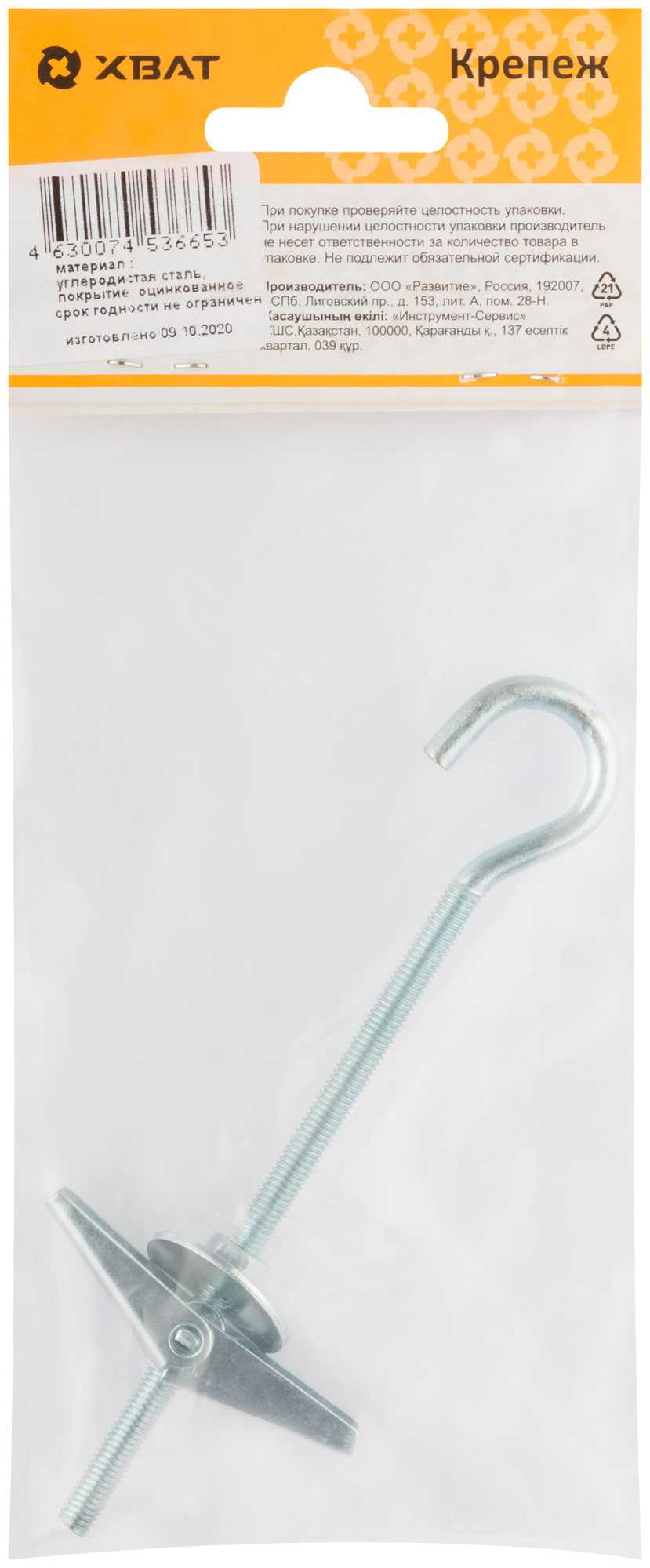 Изготовлен из стали с гальваническим цинковым покрытием, винт с крюком - стальной с гальваническим цинковым покрытием и метрической резьбой. Применяется для крепления легких конструкций к гипсокартонным плитам и другим пустотелым конструкциям.