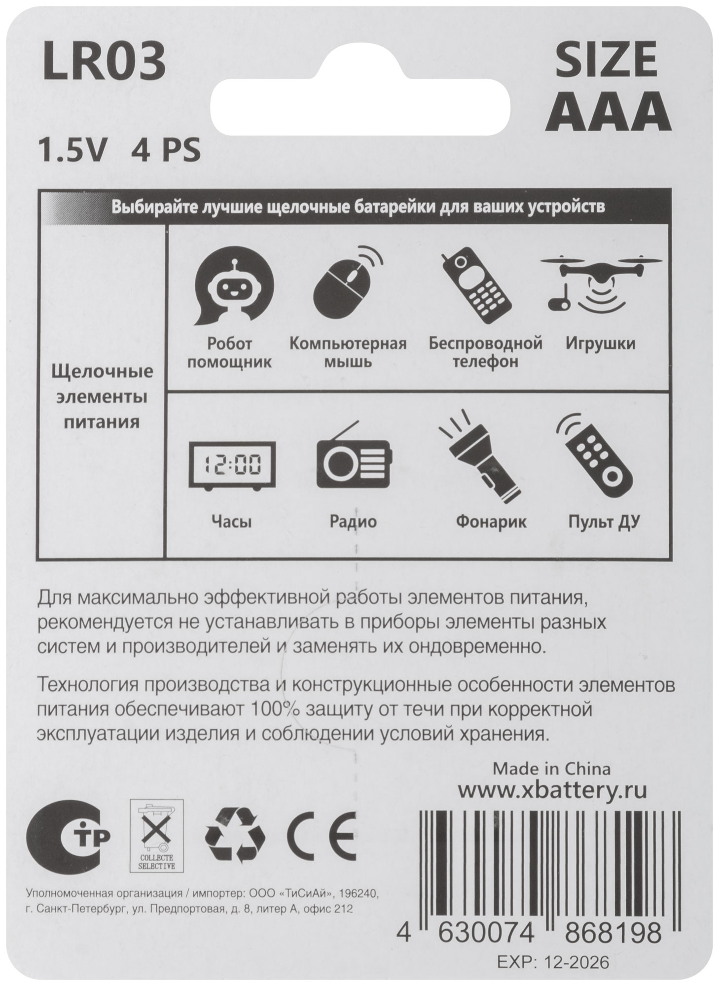 Батарейка щелочная, 1.5 В, тип АAА, 4 шт.