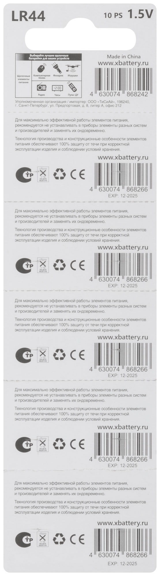 LR44 (AG13), 1,5 В, 135 мА/ч, 1,9 г. Расчетное удержание заряда при 20 °С: после 12 месяцев хранения 90%; после 24 месяцев хранения 80%. Упаковка: блистер.