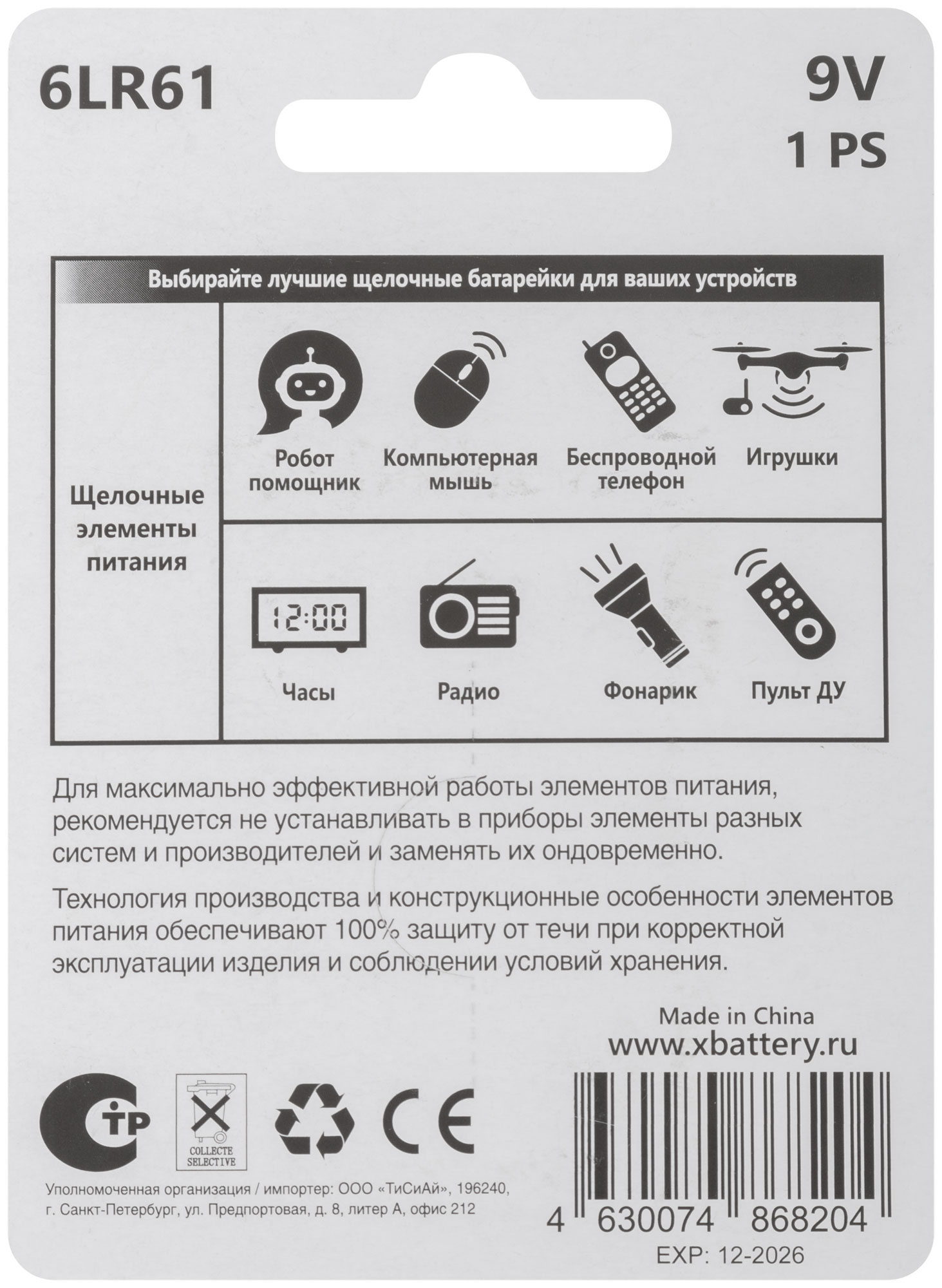 9 В, 600 мА/ч, 43-45 г. Расчетное удержание заряда при 20 °С: после 12 месяцев хранения 90%; после 24 месяцев хранения 85%. Упаковка: блистер.