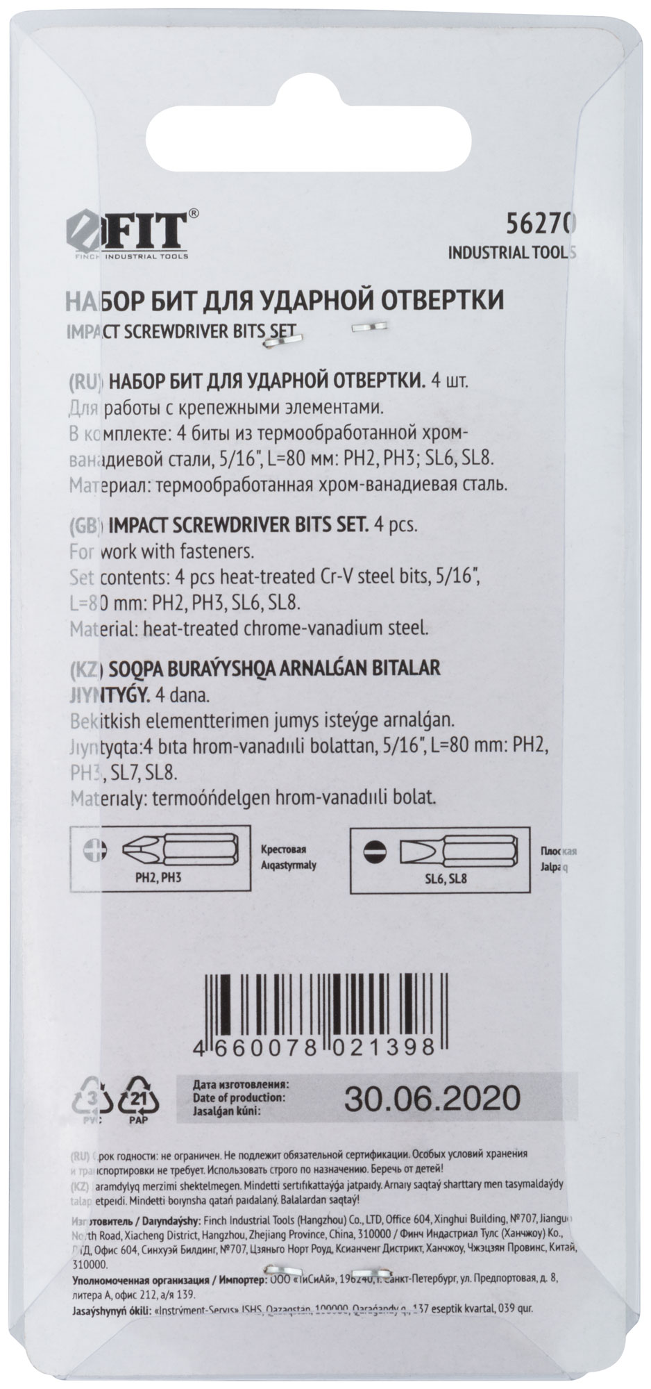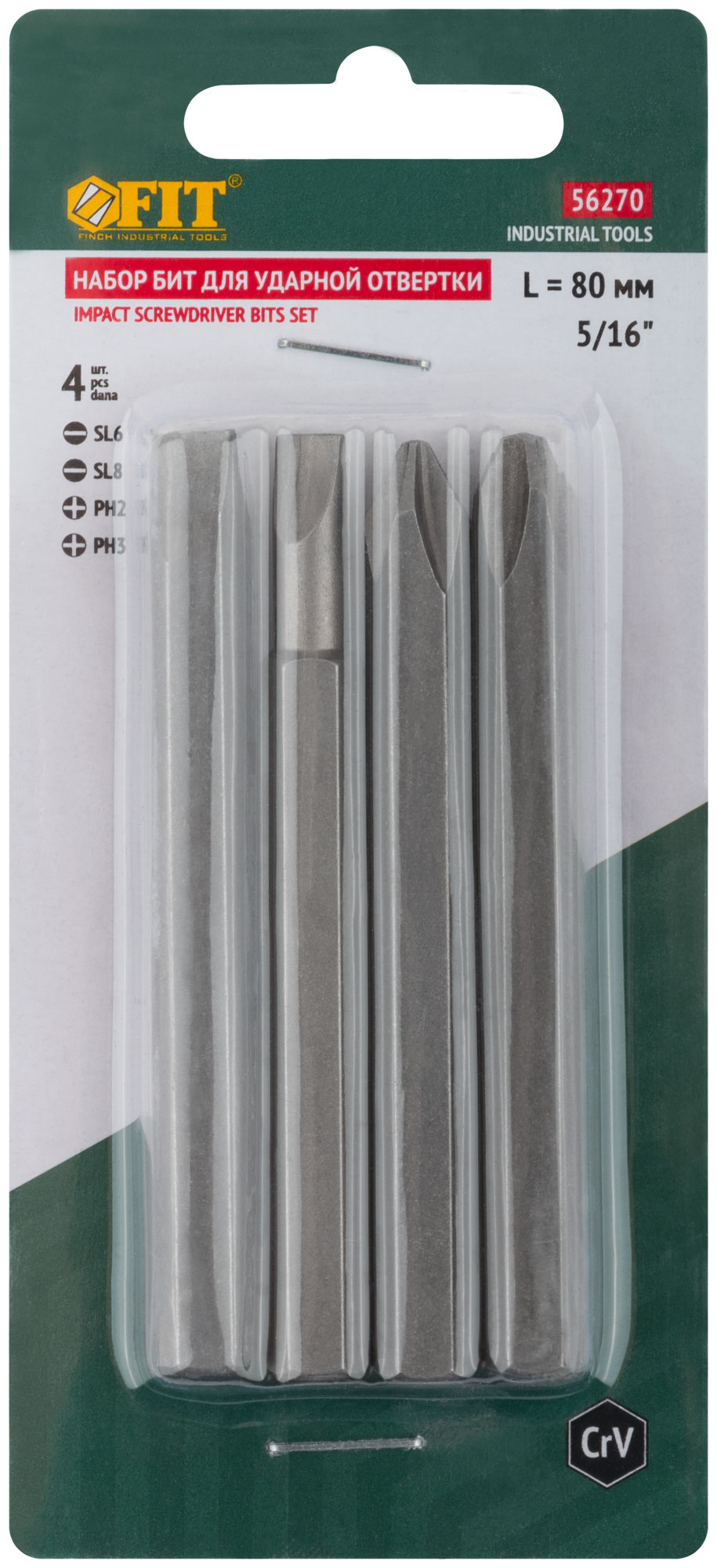 Набор 4 шт. х 80 мм. PH2, PH3, SL6, SL8. Посадочный размер 5/16". Материал: хром-ванадиевая сталь. Упаковка: блистер.