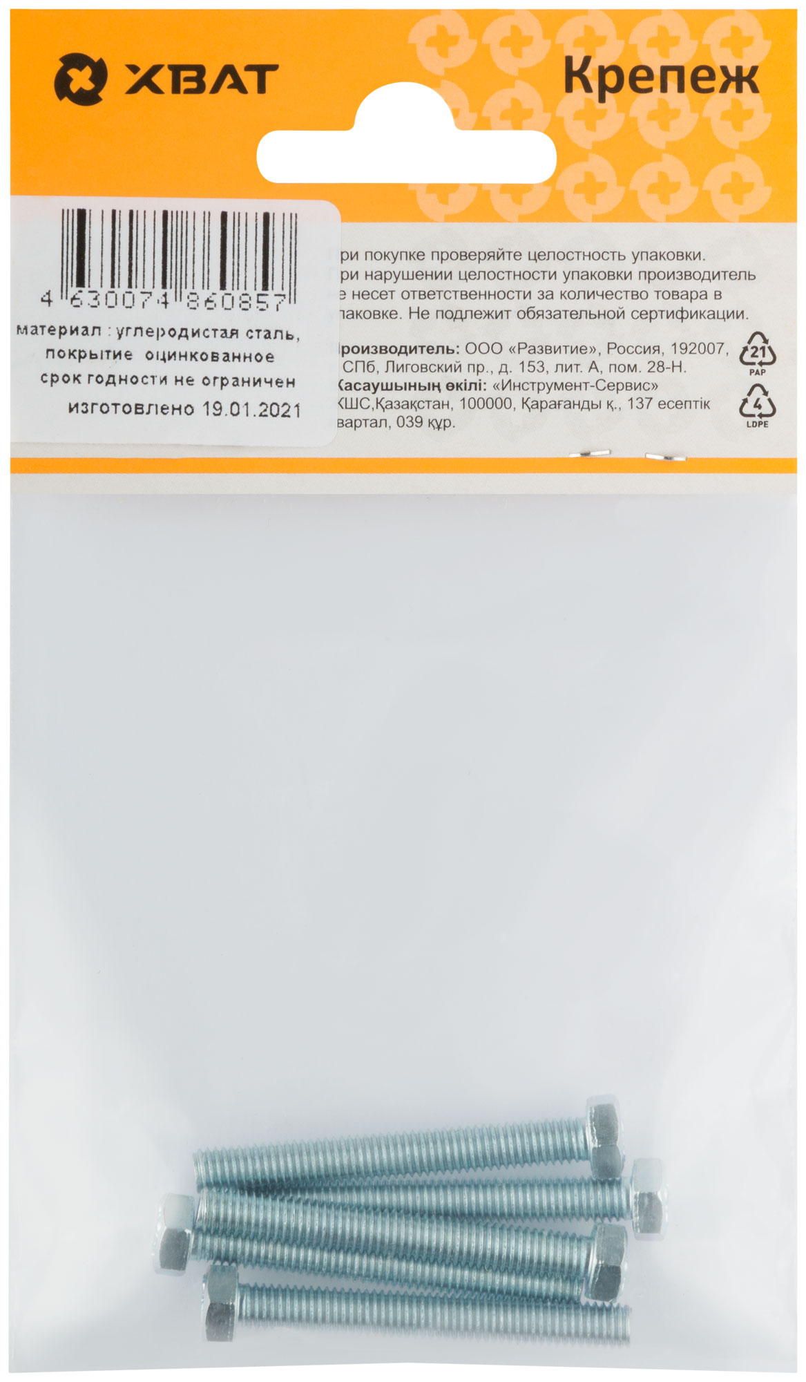 Болт изготовлен из конструкционной оцинкованной стали. Класс прочности 5.8. Рекомендуются для крепления и соединения узлов и деталей в машиностроении, строительстве. Позволяет быстро и качественно произвести монтаж.