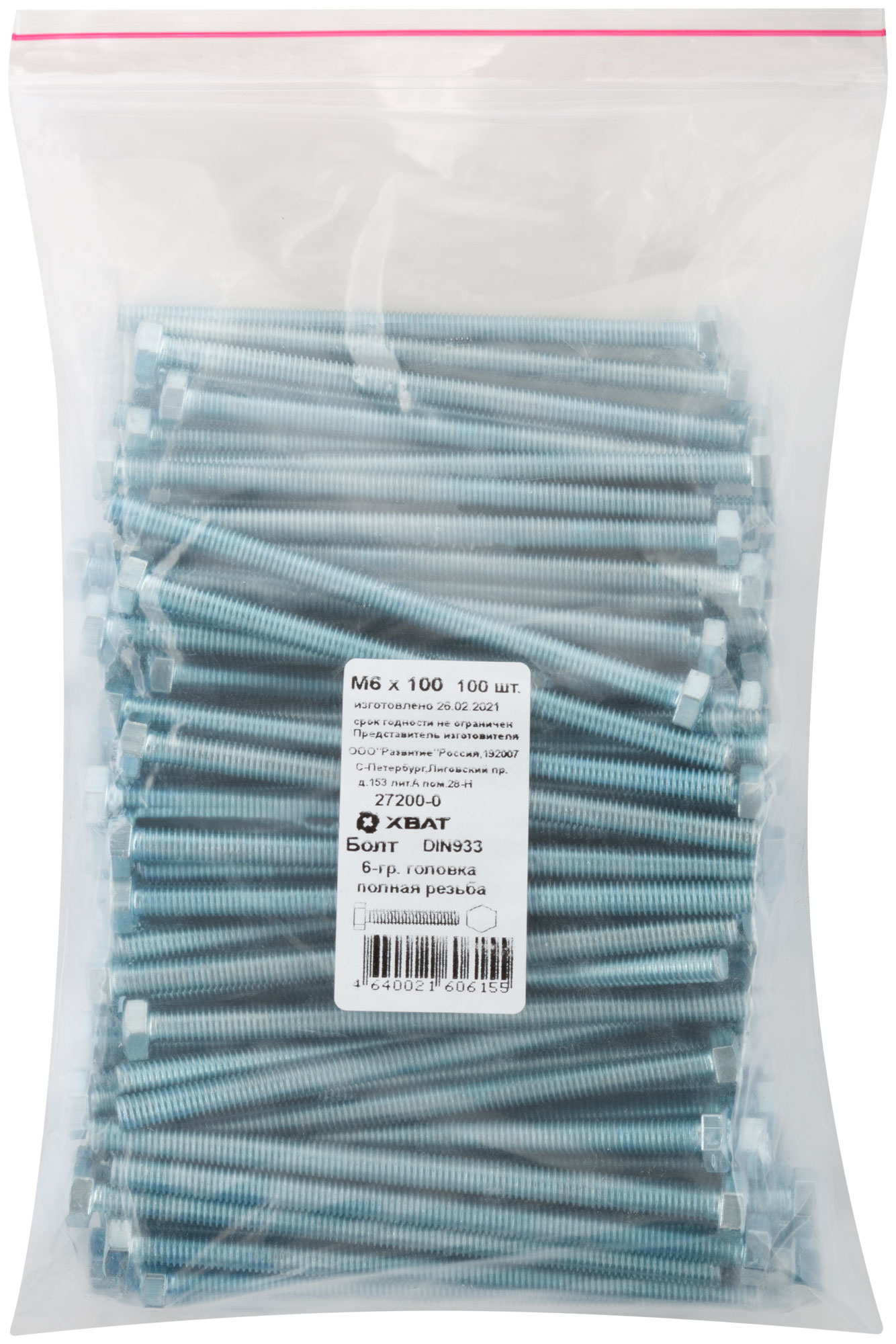 Болт 6-гранная головка (полная резьба) DIN933 М6 х 100 100 шт. Фасовка
